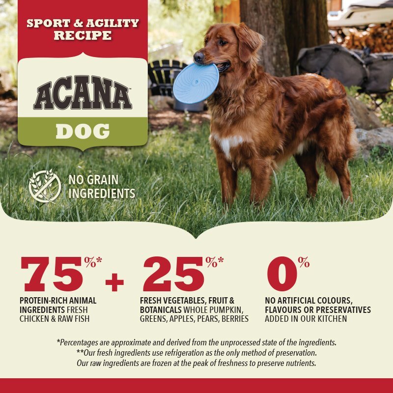 ACANA™ Sport & Agility is packed with protein and fat from animal sources, supporting sustained activity and endurance to keep up with the high energy needs of active dogs. Made with 75% quality animal ingredients like fresh free-run chicken and raw hake, to support stamina, strength and peak performance. It’s balanced with 25% fresh vegetables, fruit and botanicals, like whole pumpkin, greens, apples and pears, to provide the premium nutrition your active dog needs to live their best life.