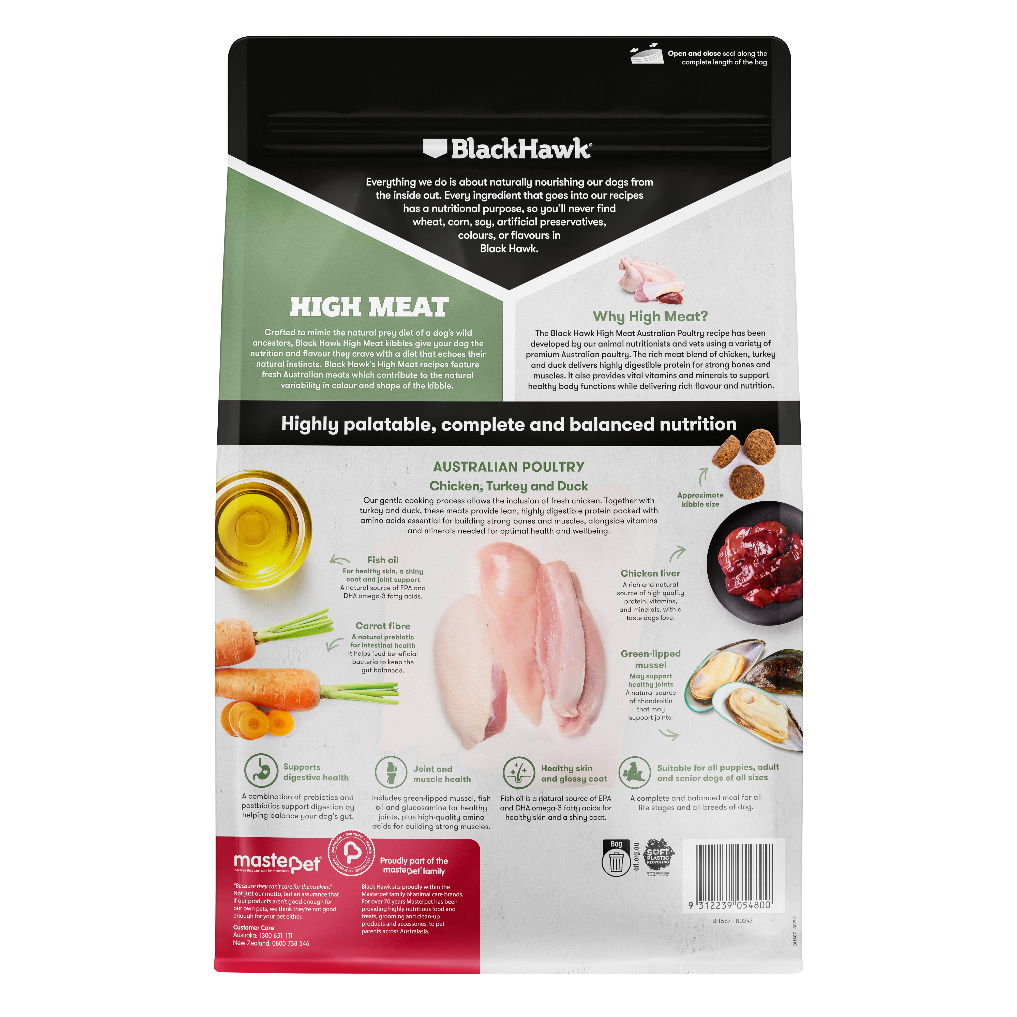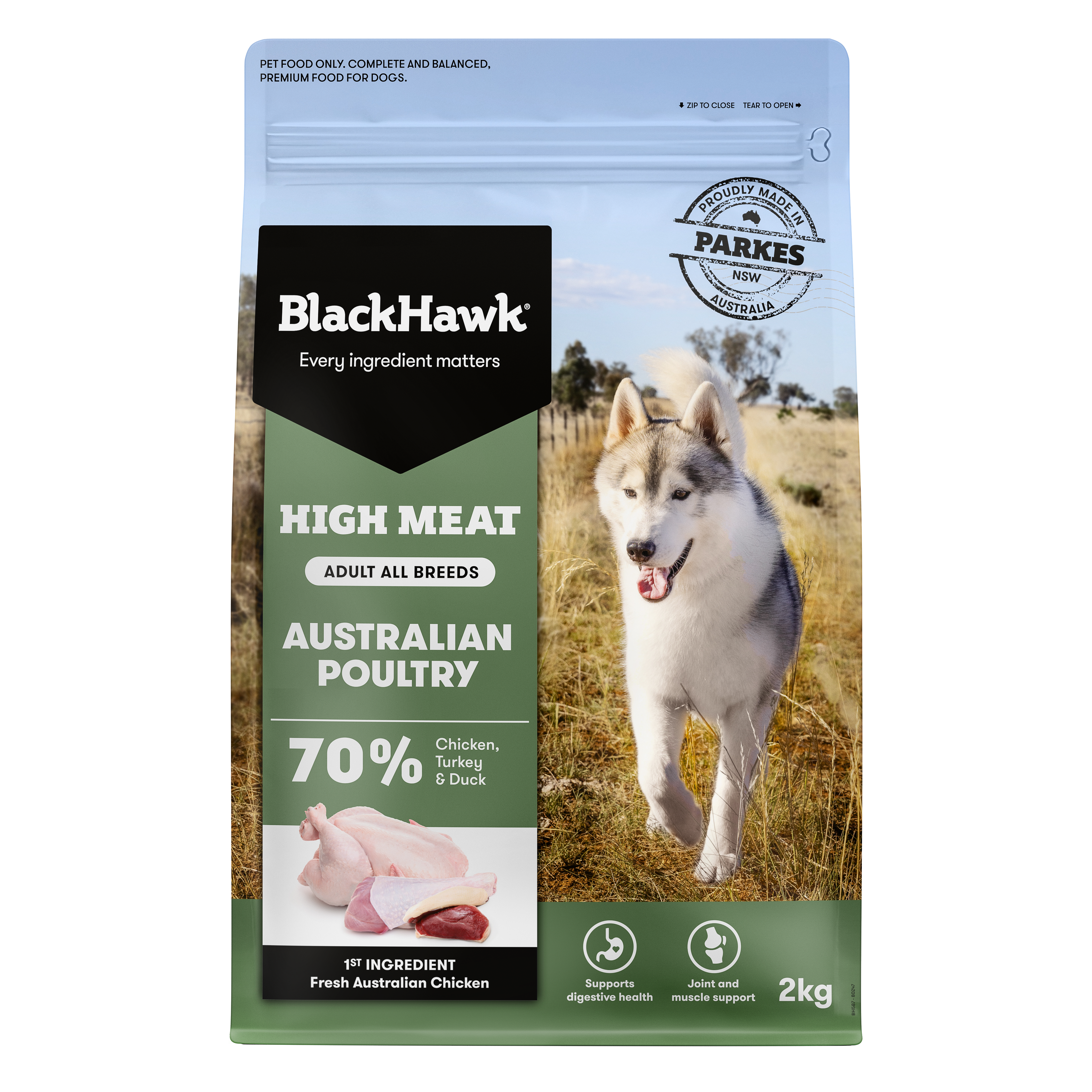 Free from artificial preservatives, colours, and flavours, Black Hawk High Meat Australian Poultry provides a premium, natural diet for dogs of all ages and sizes.