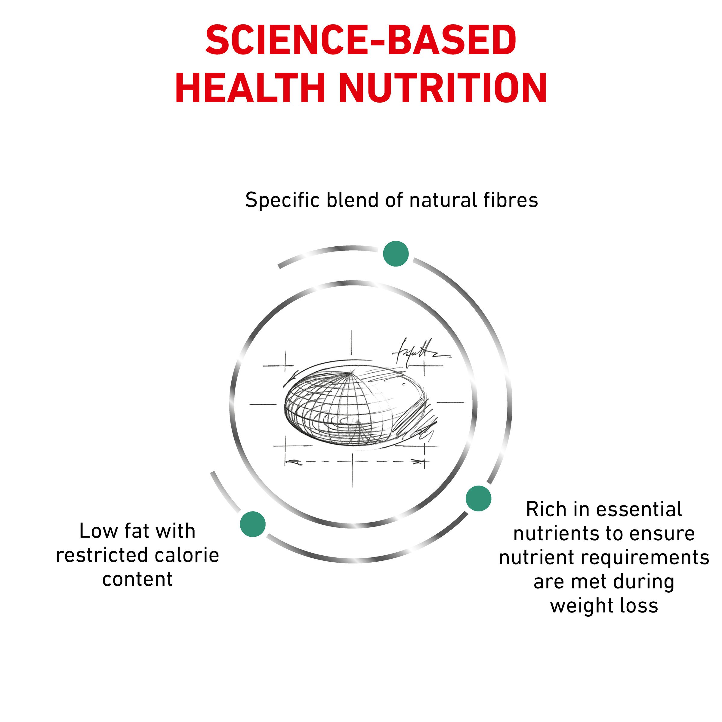 Prior to prescribing, individual target weight should be determined. The energy allowance (kcal) per kg target bodyweight is based on the cat's body condition score (BCS) however this is only an initial indication. The amount of food necessary to induce weight loss can vary between individuals, which is why close monitoring is required to regularly adapt the ration and ensure continued weight loss. It is recommended that a veterinarian’s opinion be sought before use or before extending the period of use.