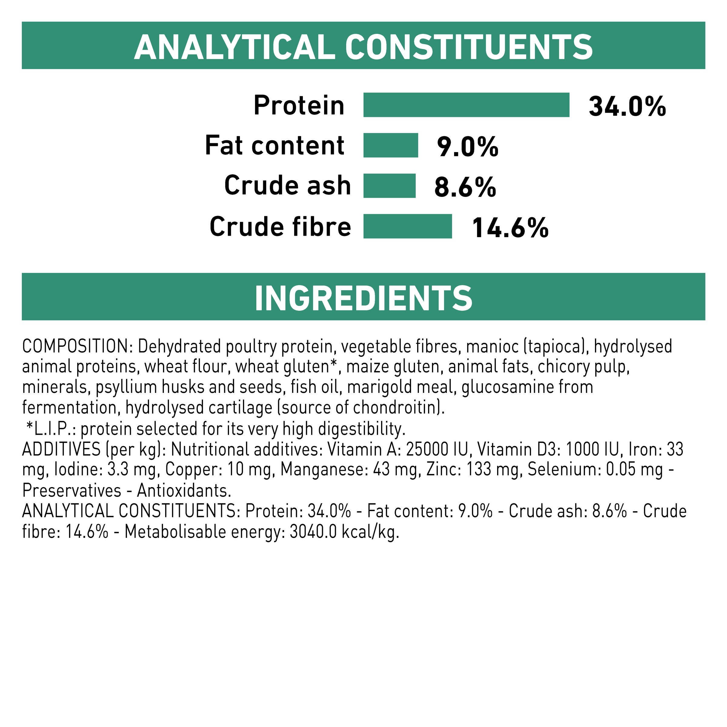 ANALYTICAL CONSTITUENTS: Protein: 34% - Fat content: 9% - Crude ash: 8.8% - Crude fibres: 13.9% - Per kg: Metabolisable energy: 3066 kcal - Omega 6 fatty acids: 18.4 g - Omega 3 fatty acids: 3.9 g.