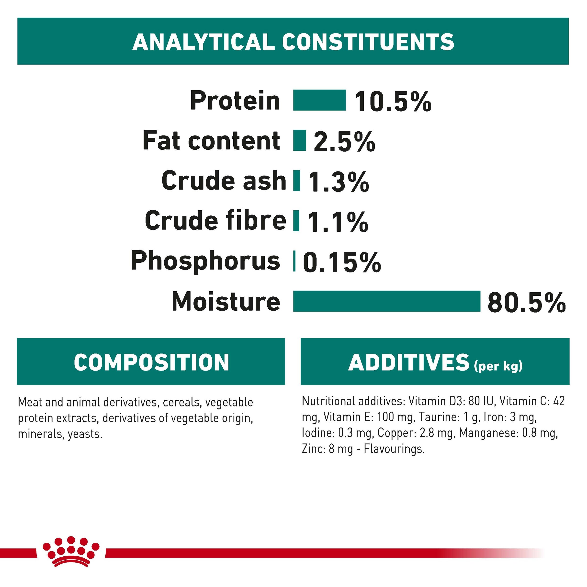Meat and animal derivatives, cereals, vegetable protein extracts, derivatives of vegetable origin, minerals, oils and fats, molluscs and crustaceans, various sugars. ADDITIVES (per kg): Nutritional additives: Vitamin D3: 265 IU, E1 (Iron): 1.8 mg, E2 (Iodine): 0.02 mg, E4 (Copper): 0.2 mg, E5 (Manganese): 0.6 mg, E6 (Zinc): 6 mg. ANALYTICAL CONSTITUENTS: Protein: 11% - Fat content: 2.2% - Crude ash: 1% - Crude fibres: 1.1%
