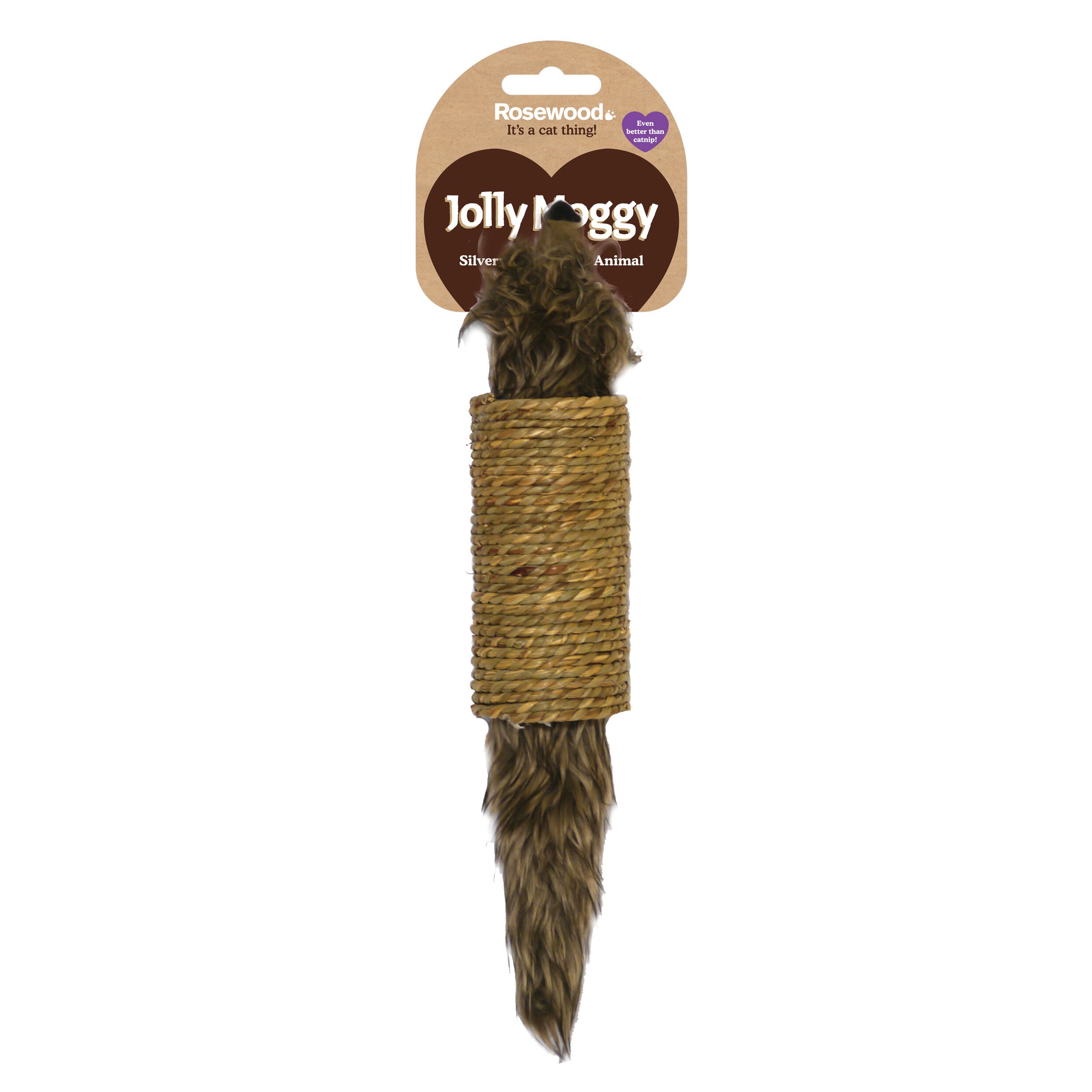 The Rosewood Jolly Moggy silvervine seagrass animal is a large, fun cat toy enhanced with silvervine, a natural attractant known to induce a very playful reaction in cats; it's even better than catnip! Includes a natural seagrass scratch roller to please paws. Plush fur appeals to feline hunting instincts. Perfect for pouncing and encouraging healthy exercise and play