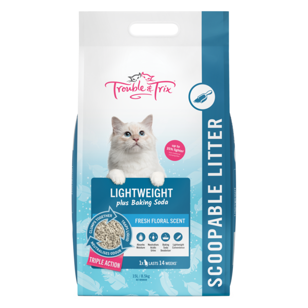 The Trouble & Trix Lightweight Fresh Floral litter uses baking soda to neutralise urine odours. Made from bentonite and cellulose which are highly absorbent, this combination traps the liquid and locks in ammonia odours providing a fresh floral scent. This natural and biodegradable litter forms an easy-to-clean one scoop clump. Its innovative lightweight formulation reduces the average bag weight of up to 35% than traditional clumping litter, making it much easier to carry around and refill the litter tray