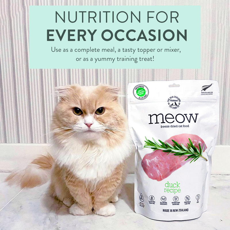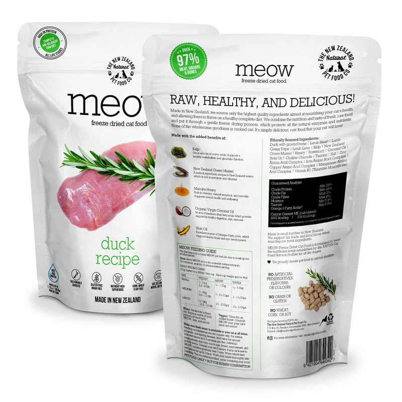 MEOW is made using only the highest quality ingredients aimed at nourishing your pet's health. We combine the nutrition and taste of fresh, raw food and put it through a gentle freeze drying process which protects all the natural enzymes and nutrients, so none of the wholesome goodness is cooked out.