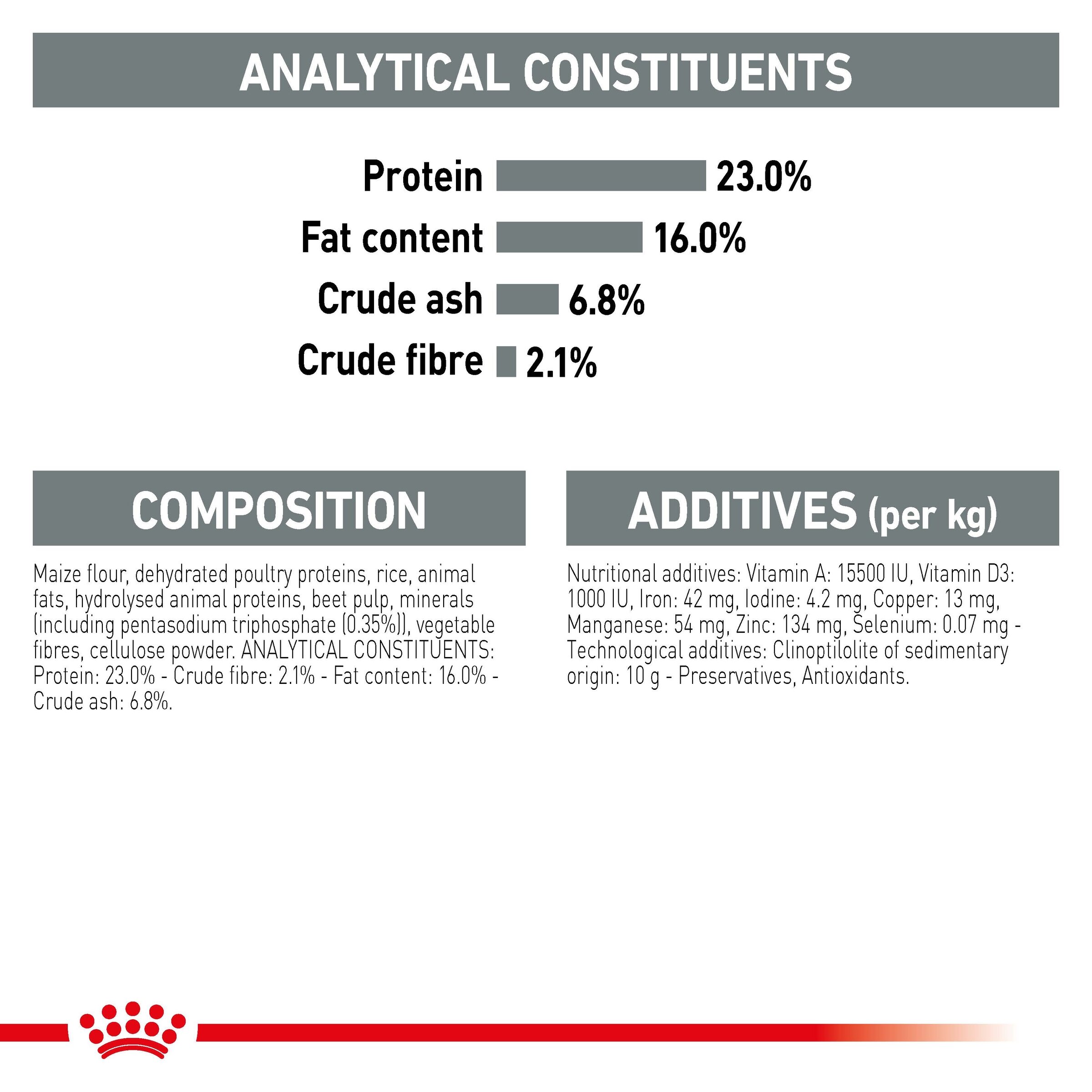 Royal Canin® takes pride in ensuring the scientific reliability of all product information. The information in this product listing was true and accurate at the time of publication. However, please note that from time to time, for example due to ingredient availability or a change in sourcing factory within our global factory network for the purpose of ongoing supply, it is necessary to make product changes at short notice, and there may be some delays in updating the information in our product materials