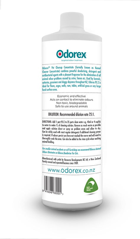 Previously called Odorex Kennel Cleaner Concentrate, Pet Cleanup Concentrate is a professional strength sanitiser, cleaner and deodorising concentrate. It combines deodorising, detergent, antibacterial agents and a pleasant fragrance for the elimination of all animal odour problems caused by urine, faeces etc. Ideal for floors, cages, walls, runs, tables, artificial grass, any large area.