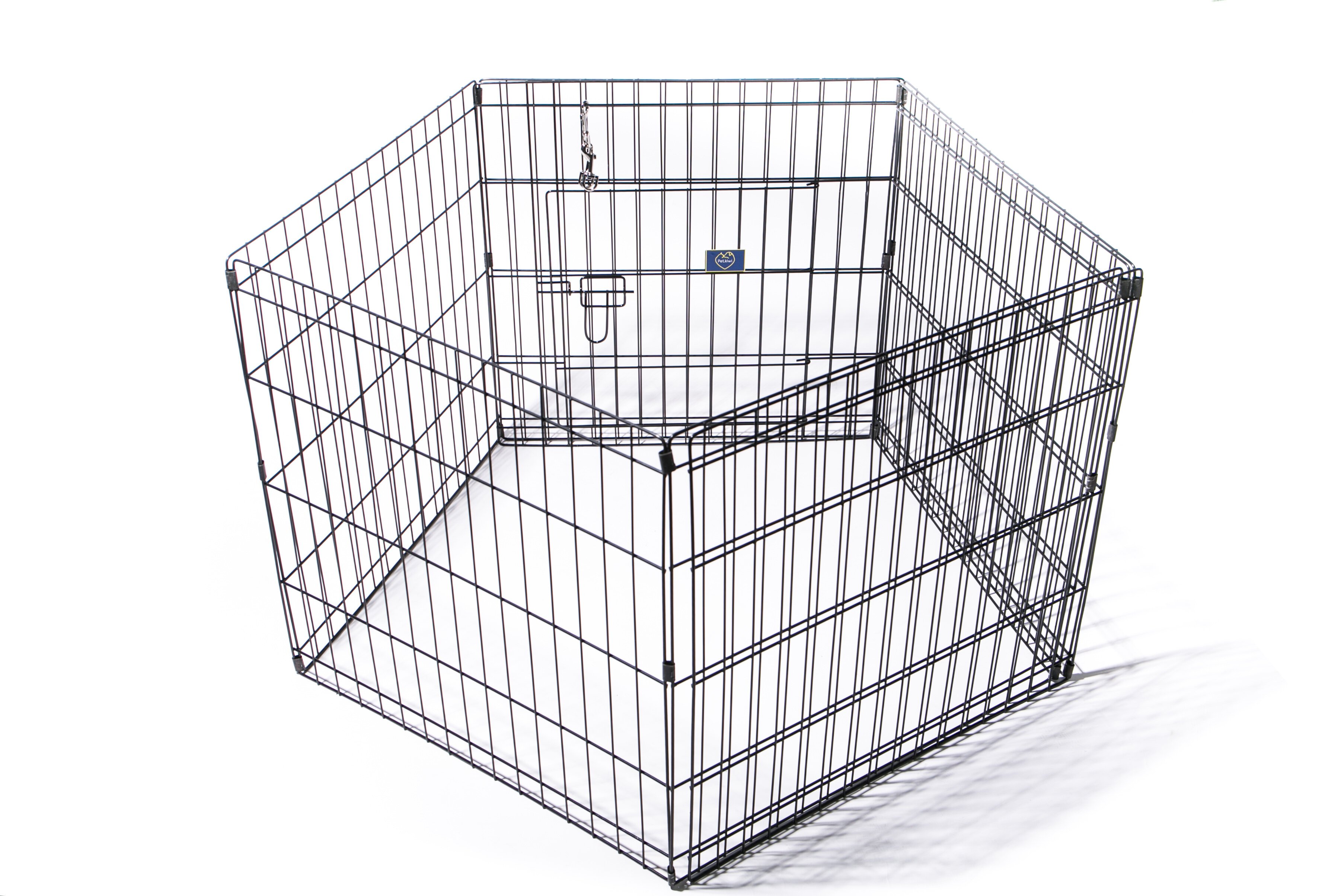 Made with powder coated steel to ensure rust resistance and durability, these play pens are perfect for indoor or outdoor use. Easily folds out without the need for tools, and folds flat for storage or travel. Includes 8 interlocking panels and a double latch door. Panels can be fixed to the floor with ground pegs (not included).