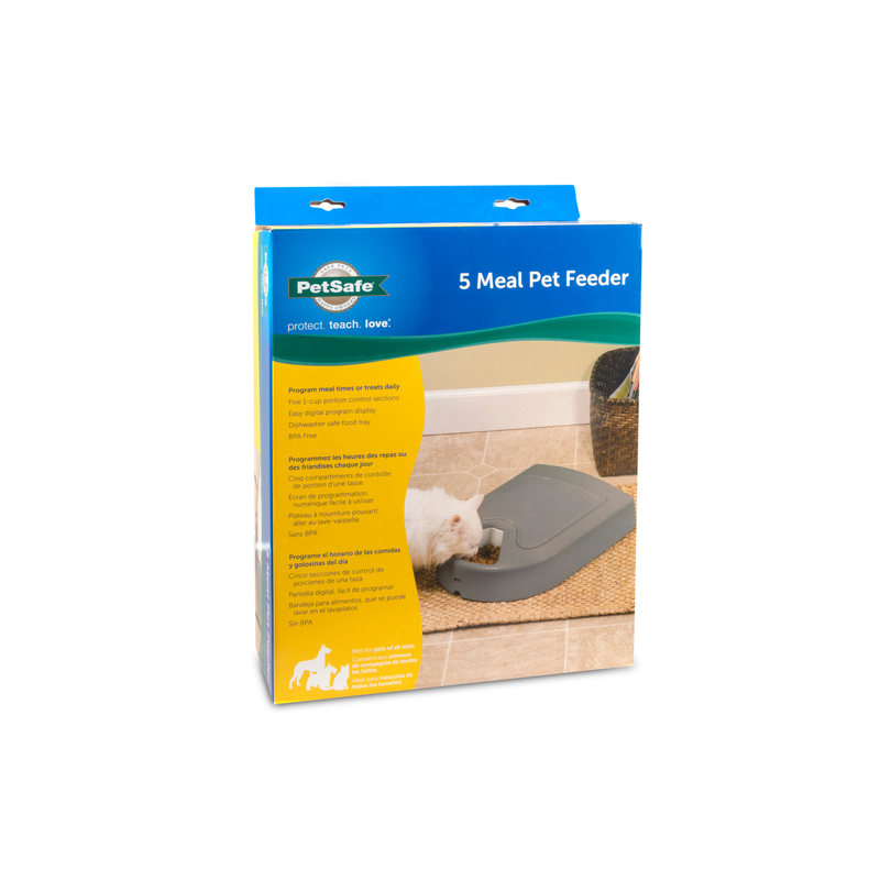 Traffic may make you late for your pet’s dinner time, but the PetSafe® 5-Meal Pet Feeder has got you covered! This automatic pet feeder has a removable tray with 5 sections that each hold 1 cup (237 ml) of dry or semi-moist food.