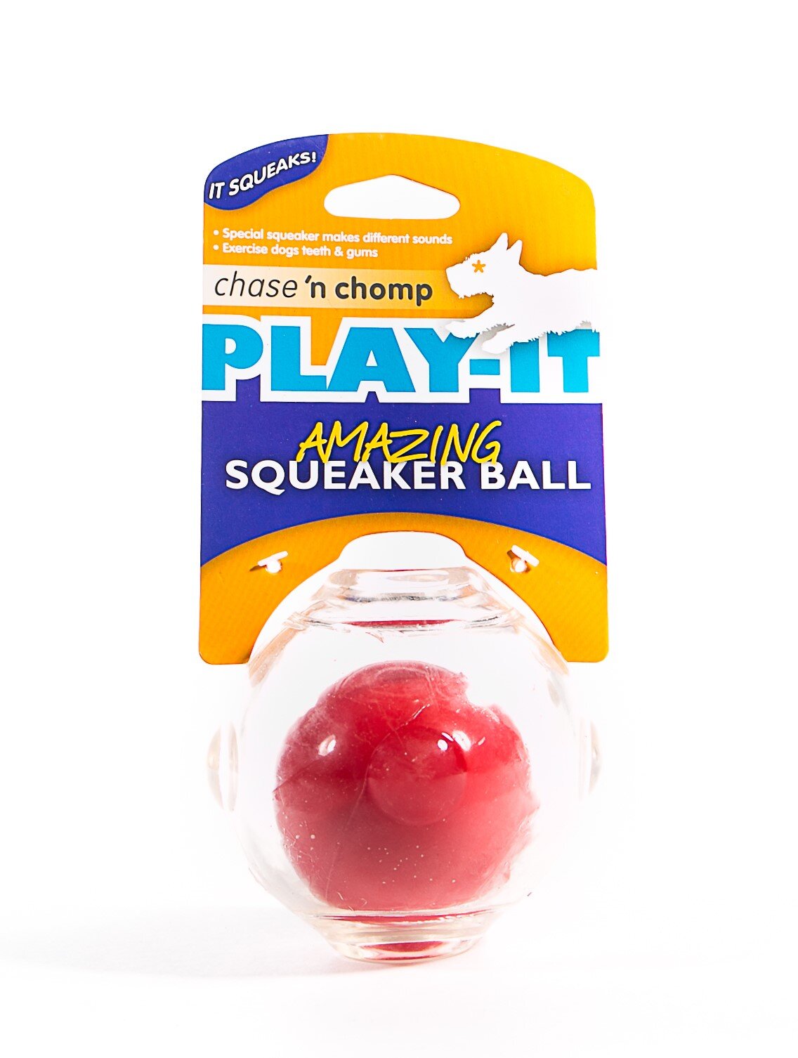 Play-it Amazing Squeaker Ball Your dog is gonna love Chase n' Chomp's durable chew toys. Dogs need to exercise their jaw and chew toys help clean their teeth and gums. Chase n' Chomp's chew toys help to prevent boredom, reduce stress, and satisfy your dog's chewing urges. Dog's can't resist the unique shape and sounds of this squeaker toy. The dual squeaker technology makes different sounds depending on how you squeeze the ball, with the squeaker hidden inside making them harder to de-squeak! Great for squeaking, tossing, chewing and chasing. Easy cleaning with gentle soap and water. It floats too! It's bouncy, squeaky, slobber slippery which adds challenge and fun! Suitable for medium- large size dogs. Measures: Small - 6.3cm Large - 8.8cm Always supervise your pet at all times and inspect toys regularly. Discard damaged toys and do not let your dog attempt to swallow toys or any pieces. Not intended for aggressive chewers.