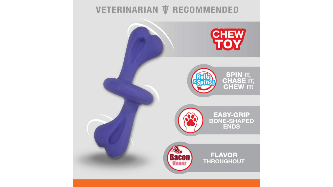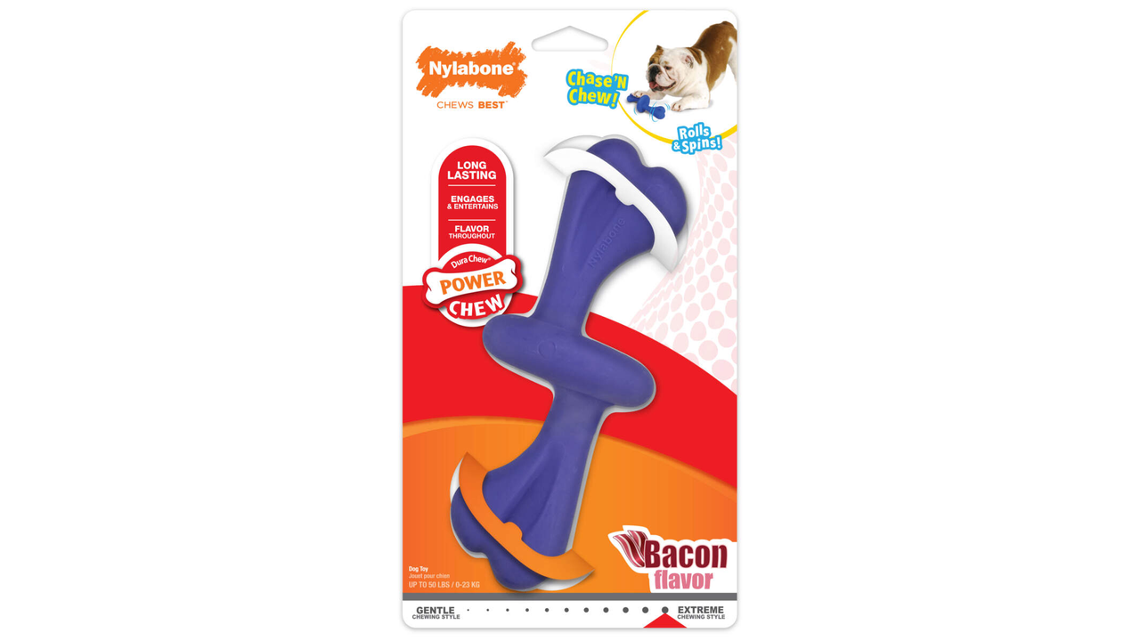 Watch your dog spin and chase the Power Chew rolling dog toy as they enjoy an exciting twist on chew time! This chew toy features two easy-grip bone-shaped ends that are comfortable to hold and chew. Plus, it helps clean teeth as dogs chew to promote a happy and healthy smile! Made from our most durable material, this dog chew toy challenges and entertains even the most powerful chewers. Satisfy your best friend's natural urge to chew with this fun dog toy!