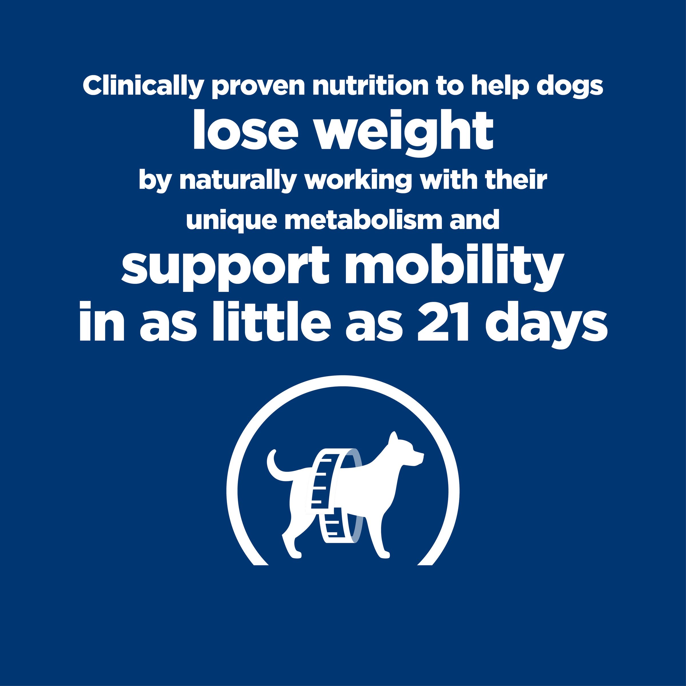 Hill's nutritionists & veterinarians developed Hill's Prescription Diet™Metabolic + Mobility Canine clinical nutrition especially formulated to help manage your dog's weight and joint health. In fact, Metabolic + Mobility Canine has clinically proven nutrition to support mobility in as little as 21 days AND reduce body weight by 13% in 60 days.