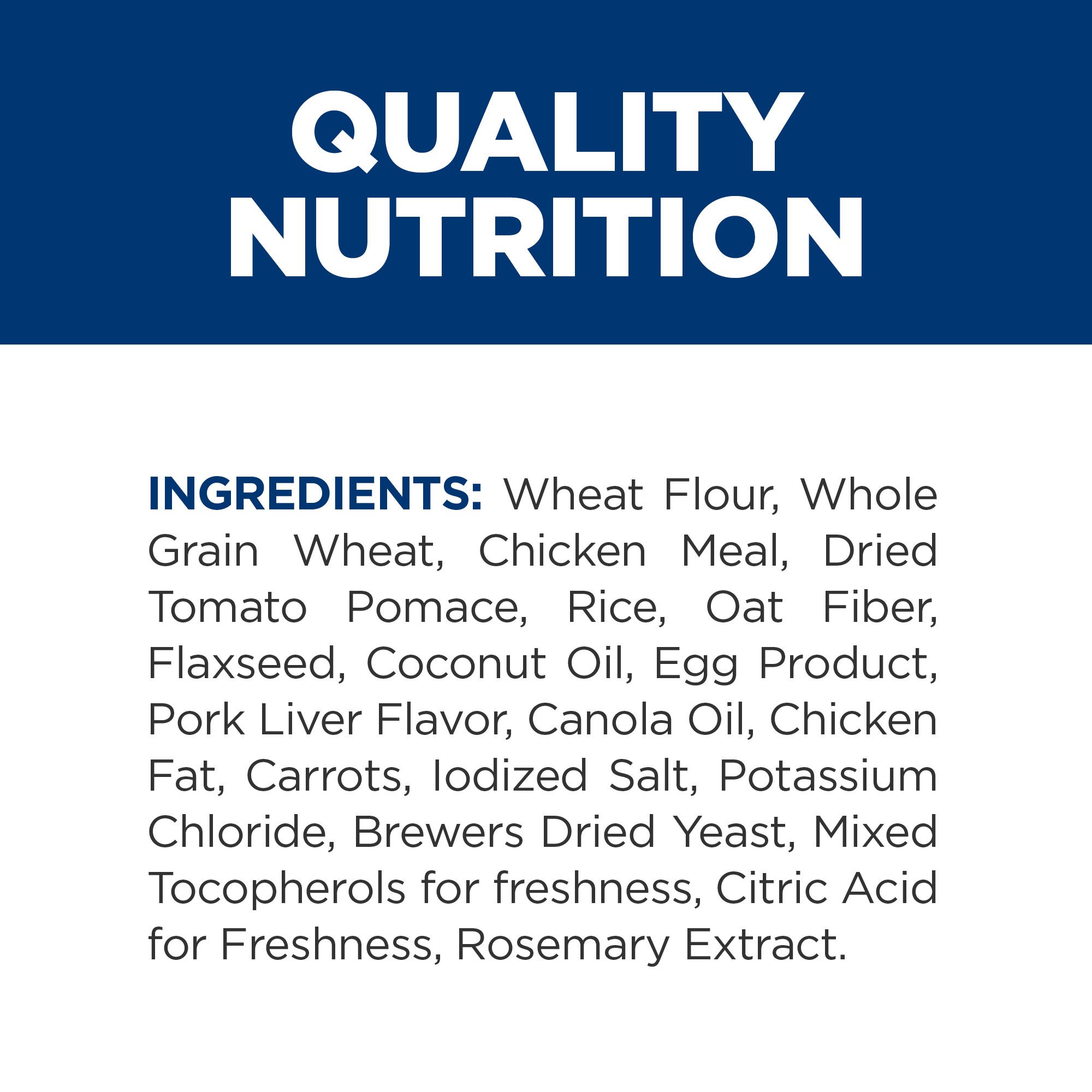 Whole Grain Wheat, Wheat Flour, Chicken Meal, Tomato Pomace, Rice Flour, Flaxseed, Oat Fiber, Coconut Oil, Pork Liver Flavor, Canola Oil, Dried Egg Product, Chicken Fat, Dried Carrots, Iodized Salt, Potassium Chloride, Brewers Dried Yeast, Mixed tocopherols added to retain freshness, Citric Acid added to retain freshness, Rosemary Extract.
