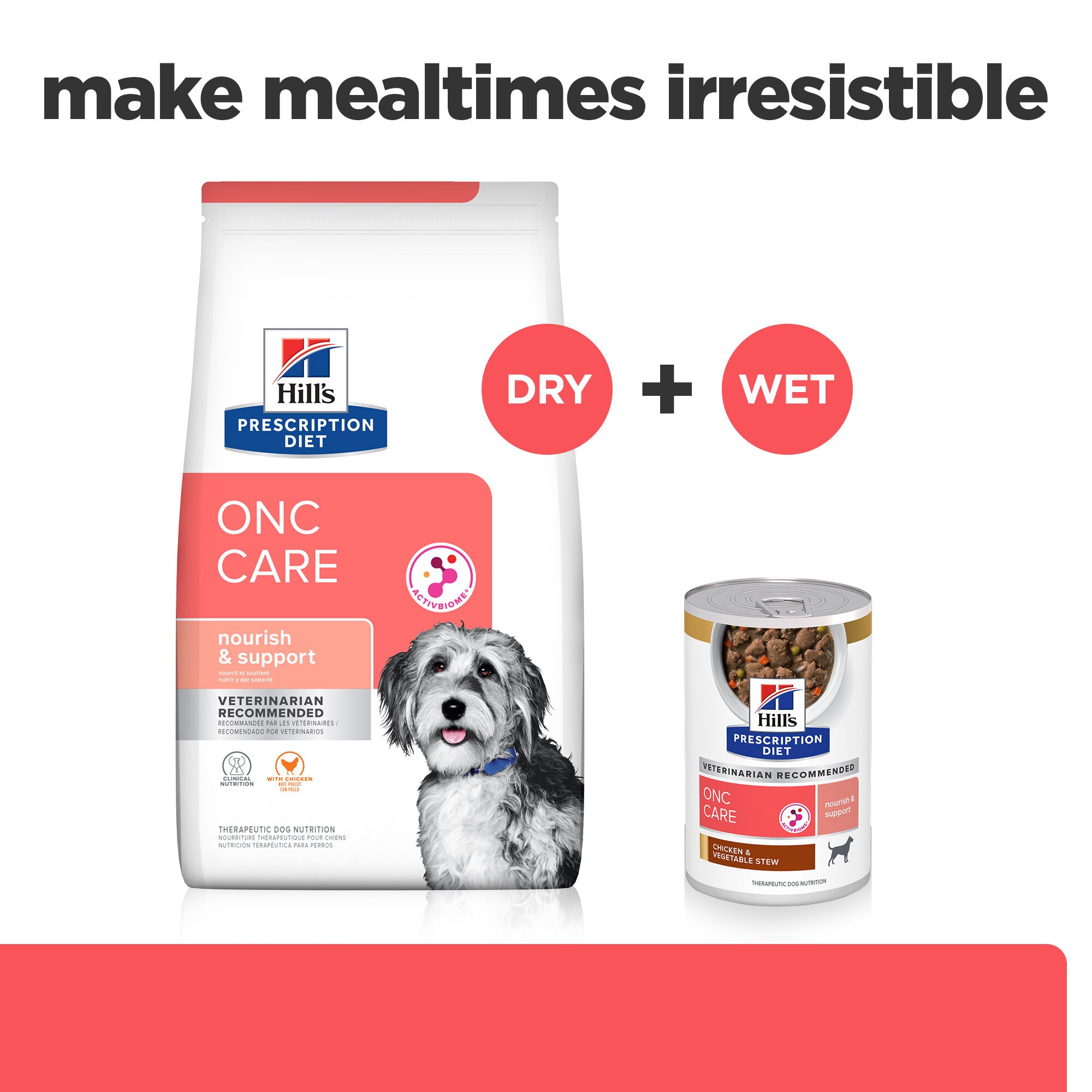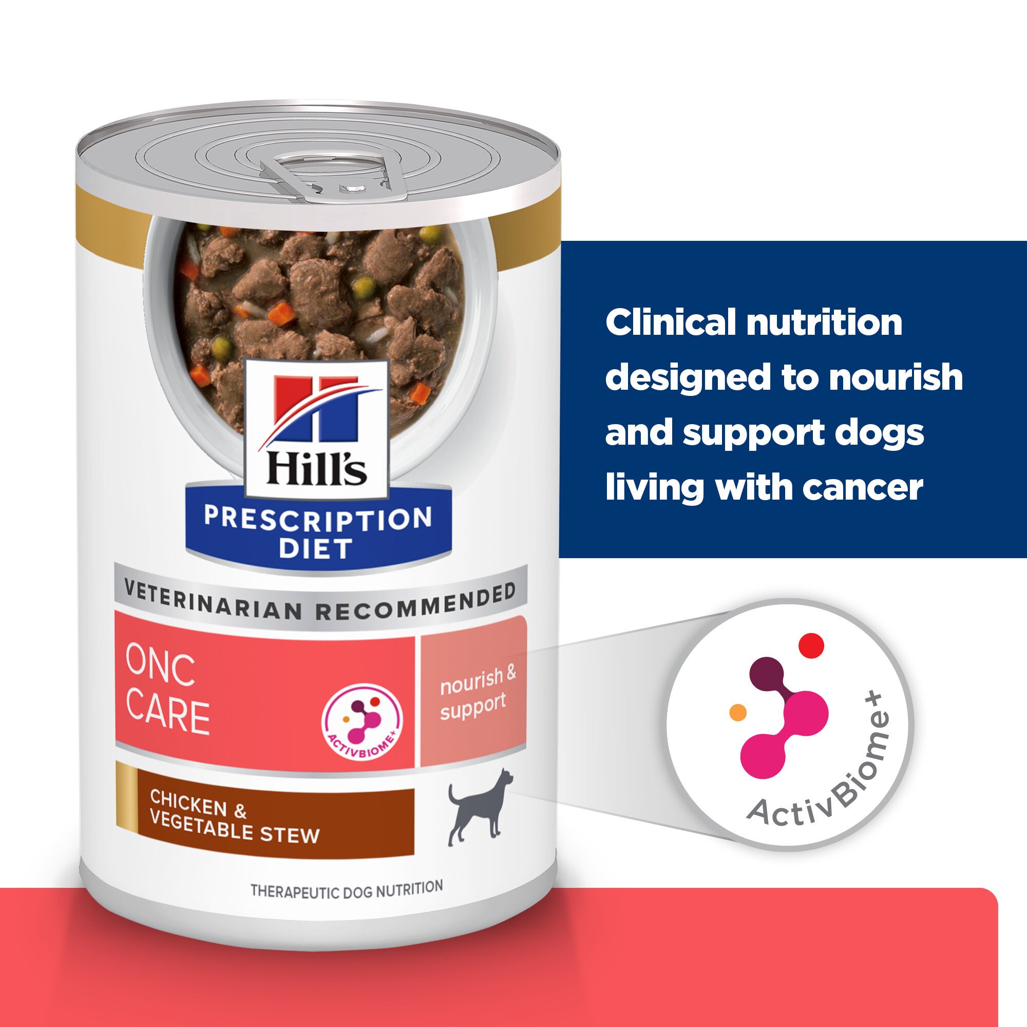 Hill's Prescription Diet ONC Care Chicken & Vegetable Stew Dog Food is clinical nutrition designed to nourish and support dogs living with serious illness such as cancer. It’s made in the USA with global ingredients you can trust, and was developed by Hill’s nutritionists and veterinarians. This food has an irresistible taste to encourage eating from the very first bowl. It is also formulated with highly digestible protein to help maintain strength and energy as well as ActivBiome+ technology to nourish your dog's gut microbiome. Please consult your veterinarian for further information on how Prescription Diet foods can help your dog continue to enjoy a happy and active life.