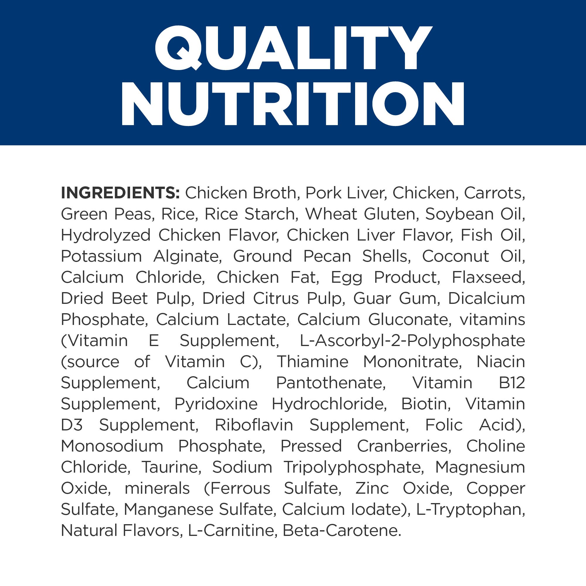 Chicken Broth, Pork Liver, Chicken, Carrots, Wheat Gluten, Rice Starch, Spinach, Natural Flavor, Chicken Fat, Soybean Oil, Rice, Potassium Alginate, Fish Oil, Ground Pecan Shells, Coconut Oil, Calcium Chloride, Egg Product, Flaxseed, Dried Beet Pulp, Dried Citrus Pulp, L-Arginine, Guar Gum, Dicalcium Phosphate, Choline Chloride, Calcium Lactate, Calcium Gluconate, vitamins (Vitamin E Supplement, L-Ascorbyl-2-Polyphosphate (source of Vitamin C), Thiamine Mononitrate, Niacin Supplement, Calcium Pantothenate, Vitamin B12 Supplement, Pyridoxine Hydrochloride, Biotin, Vitamin D3 Supplement, Riboflavin Supplement, Folic Acid), Taurine, Pressed Cranberries, Monosodium Phosphate, Sodium Tripolyphosphate, Magnesium Oxide, Natural Flavors, L-Carnitine, minerals (Ferrous Sulfate, Zinc Oxide, Copper Sulfate, Manganese Sulfate, Calcium Iodate), Beta-Carotene.