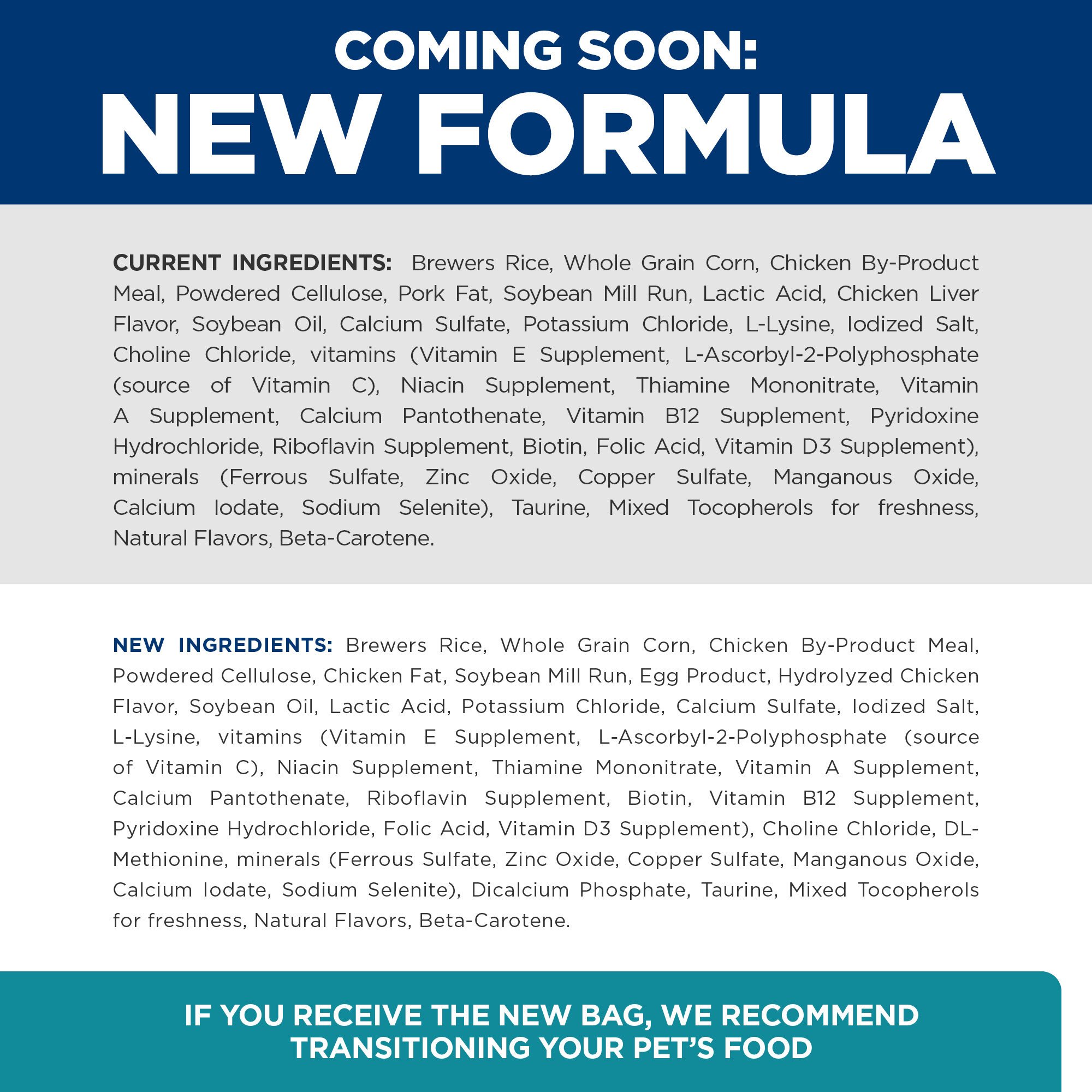 Brewers Rice, Whole Grain Corn, Chicken By-Product Meal, Powdered Cellulose, Pork Fat, Soybean Mill Run, Lactic Acid, Soybean Oil, Chicken Liver Flavor, Calcium Sulfate, Potassium Chloride, L-Lysine, Iodized Salt, Choline Chloride, vitamins (Vitamin E Supplement, L-Ascorbyl-2-Polyphosphate (source of vitamin C), Niacin Supplement, Thiamine Mononitrate, Vitamin A Supplement, Calcium Pantothenate, Biotin, Vitamin B12 Supplement, Pyridoxine Hydrochloride, Riboflavin Supplement, Folic Acid, Vitamin D3 Supplement), Taurine, minerals (Ferrous Sulfate, Zinc Oxide, Copper Sulfate, Manganous Oxide, Calcium Iodate, Sodium Selenite), Mixed Tocopherols for freshness, Phosphoric Acid, Beta-Carotene, Natural Flavors.