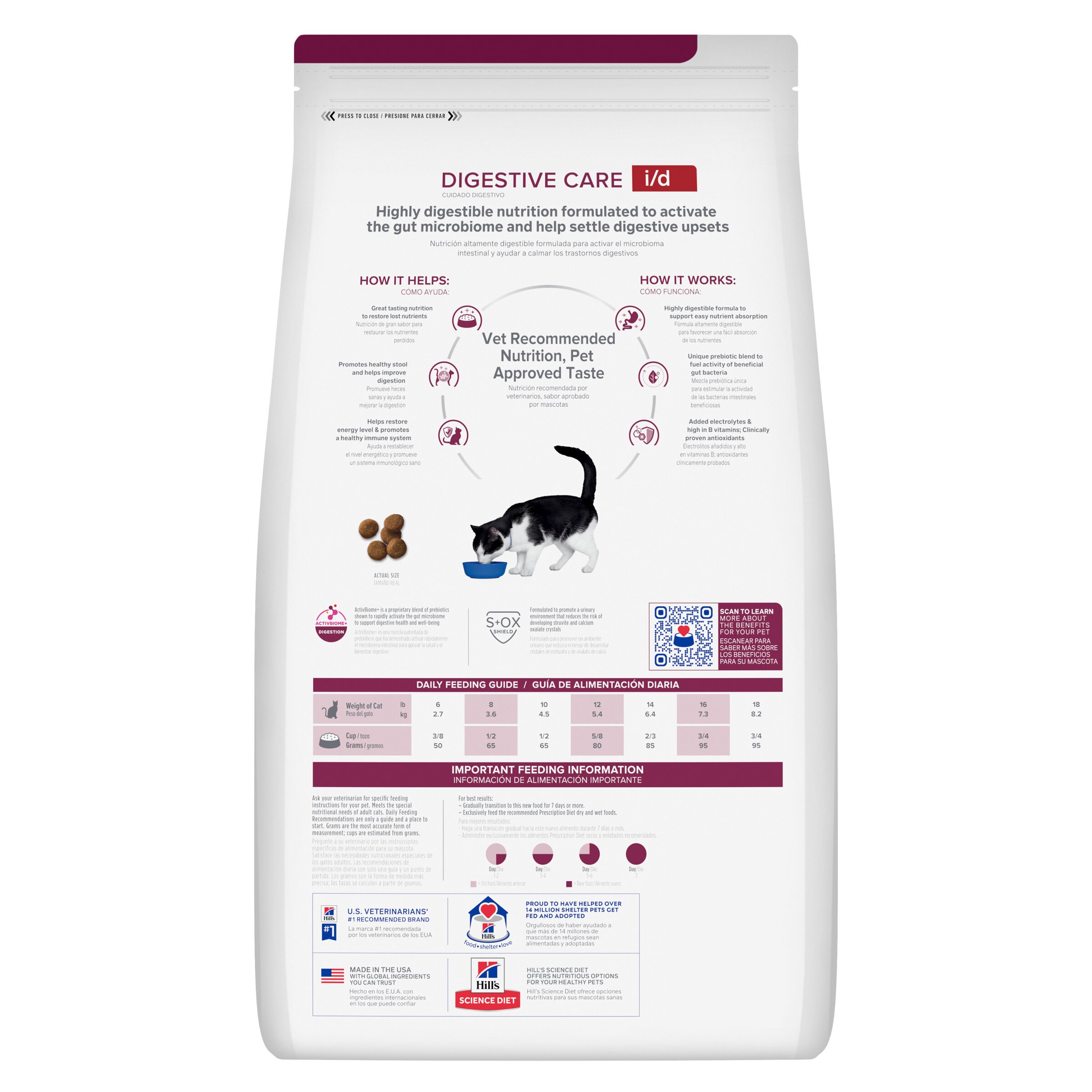 Hill’s Prescription Diet i/d Digestive Care Dry Cat Food is great tasting highly digestible nutrition clinically shown to help settle digestive upsets in cats. This dry cat food contains electrolytes and B vitamins to help replace lost nutrients. It also has clinically proven antioxidants for a healthy immune system and omega 3 & 6 fatty acids. Plus, this highly digestible formula helps ensure easy nutrient absorption. It meets the special nutritional needs of kittens and adult cats. It’s made in the USA with global ingredients you can trust, and was developed by Hill’s nutritionists and veterinarians. Please consult your veterinarian for further information on how Prescription Diet foods can help your cat continue to enjoy a happy and active life.