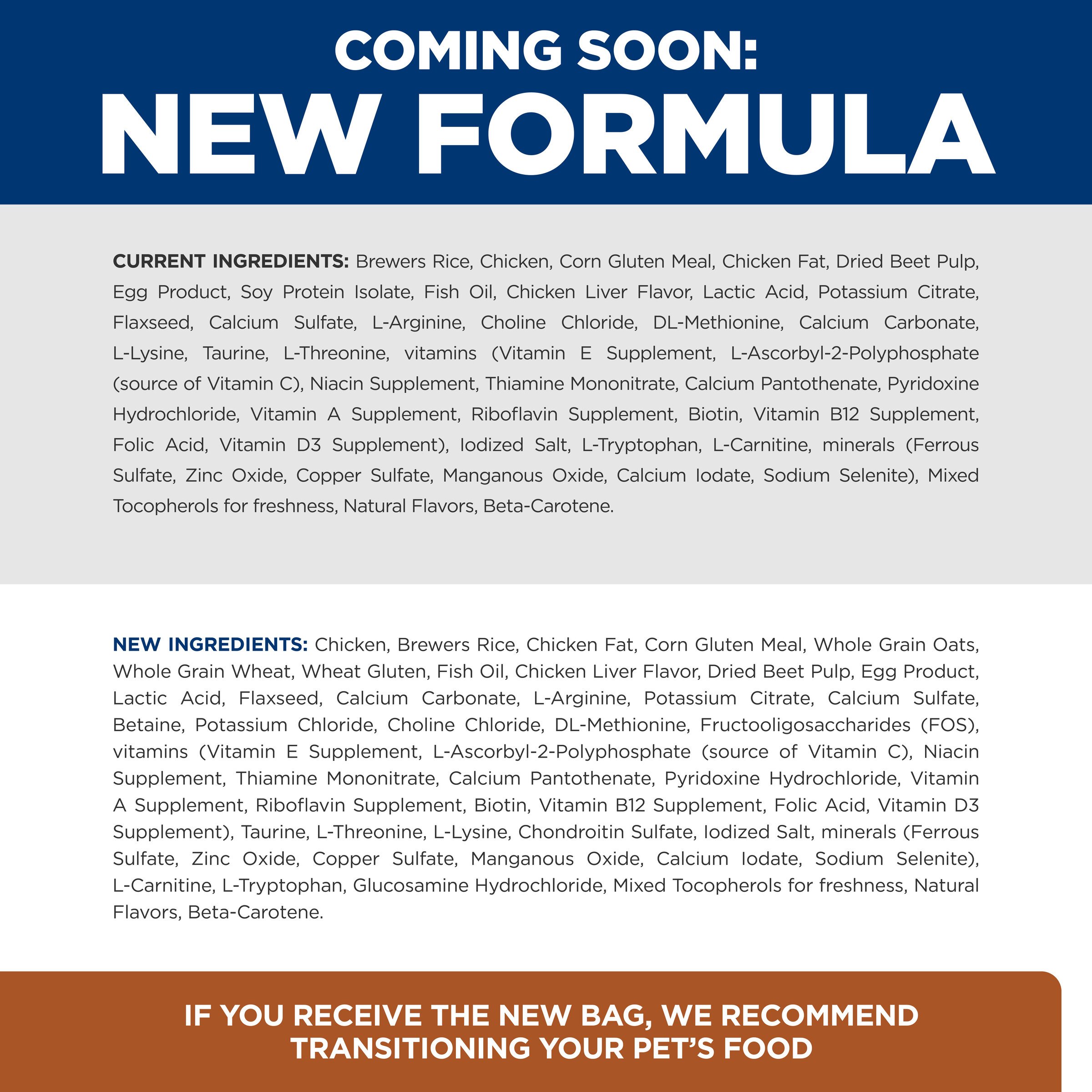 Brown Rice, Corn Gluten Meal, Chicken, Pork Fat, Whole Grain Wheat, Cracked Pearled Barley, Wheat Gluten, Chicken Liver Flavor, Pea Protein, Egg Product, Fish Oil, Lactic Acid, Potassium Citrate, Calcium Sulfate, L-Lysine, L-Arginine, Choline Chloride, Calcium Carbonate, vitamins (Vitamin E Supplement, L-Ascorbyl-2-Polyphosphate (source of Vitamin C), Niacin Supplement, Thiamine Mononitrate, Vitamin A Supplement, Calcium Pantothenate, Pyridoxine Hydrochloride, Biotin, Vitamin B12 Supplement, Riboflavin Supplement, Folic Acid, Vitamin D3 Supplement, Menadione Sodium Bisulfite Complex (source of Vitamin K)), L-Threonine, Taurine, Iodized Salt, DL-Methionine, minerals (Ferrous Sulfate, Zinc Oxide, Copper Sulfate, Manganous Oxide, Calcium Iodate, Sodium Selenite), Potassium Chloride, L-Carnitine, L-Tryptophan, Mixed Tocopherols for freshness, Natural Flavors, Beta-Carotene.