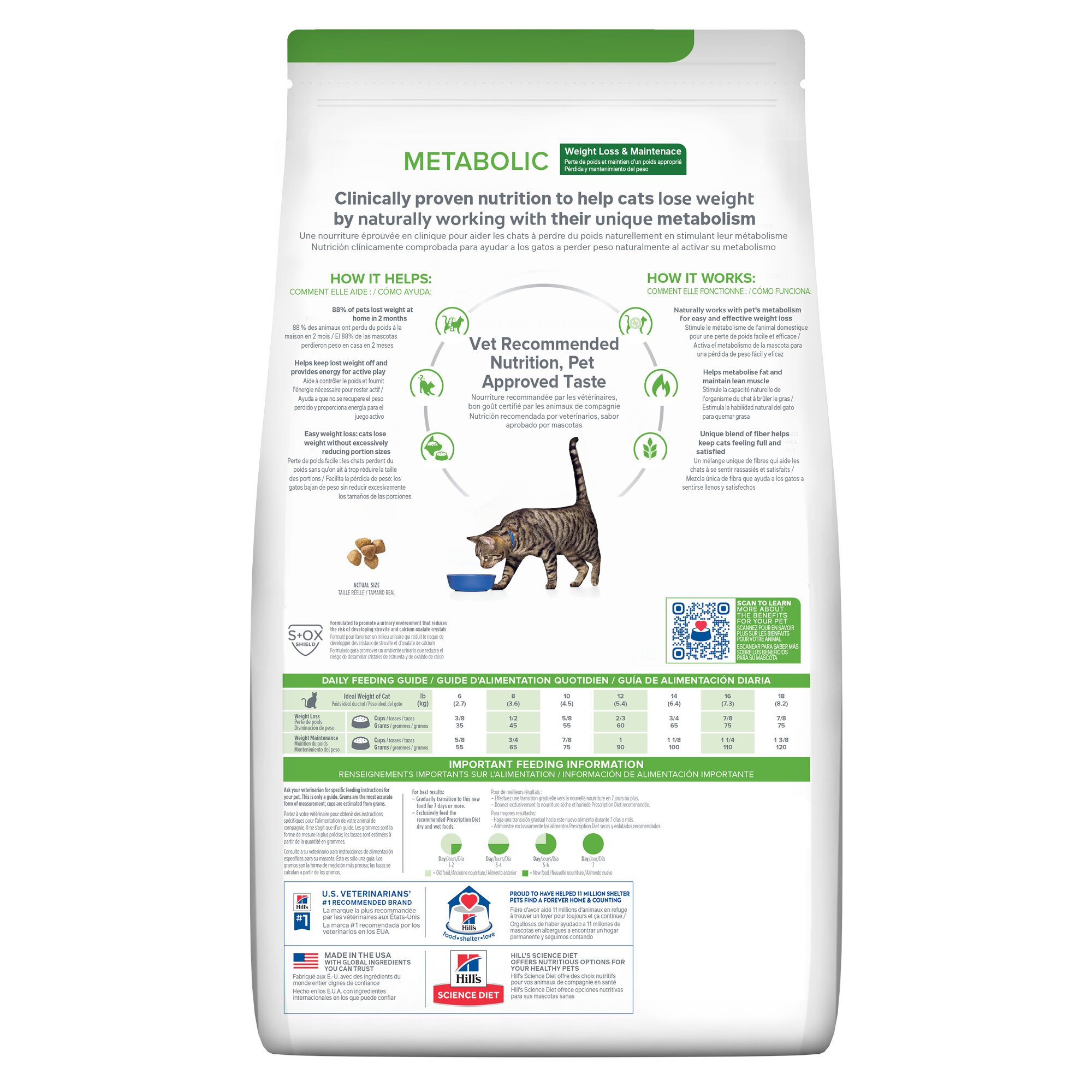 Hill's nutritionists & veterinarians developed Hill's Prescription Diet™Metabolic clinical nutrition specially formulated to support your cat's weight management. In fact, 88% of pets lost weight at home in 2 months when fed the nutrition of Metabolic.