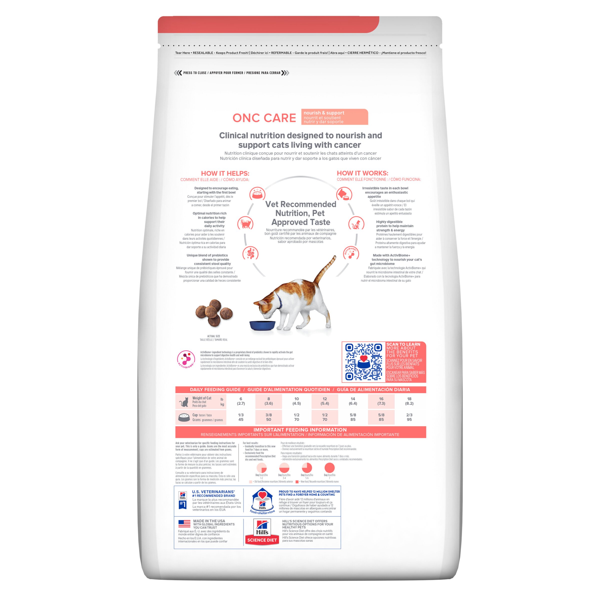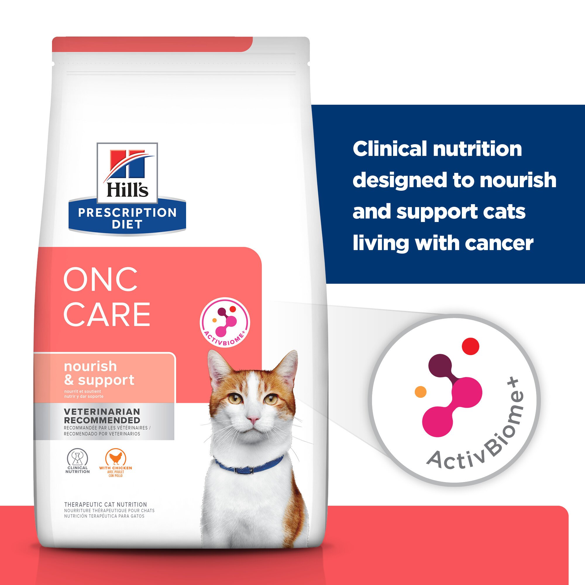 Hill's Prescription Diet ONC Care with Chicken Dry Cat Food is clinical nutrition designed to nourish and support cats living with serious illness such as cancer. It’s made in the USA with global ingredients you can trust, and was developed by Hill’s nutritionists and veterinarians. This food has an irresistible taste to encourage eating from the very first bowl. It is also formulated with highly digestible protein to help maintain strength and energy as well as ActivBiome+ technology to nourish your cat's gut microbiome. Please consult your veterinarian for further information on how Prescription Diet foods can help your cat continue to enjoy a happy and active life.