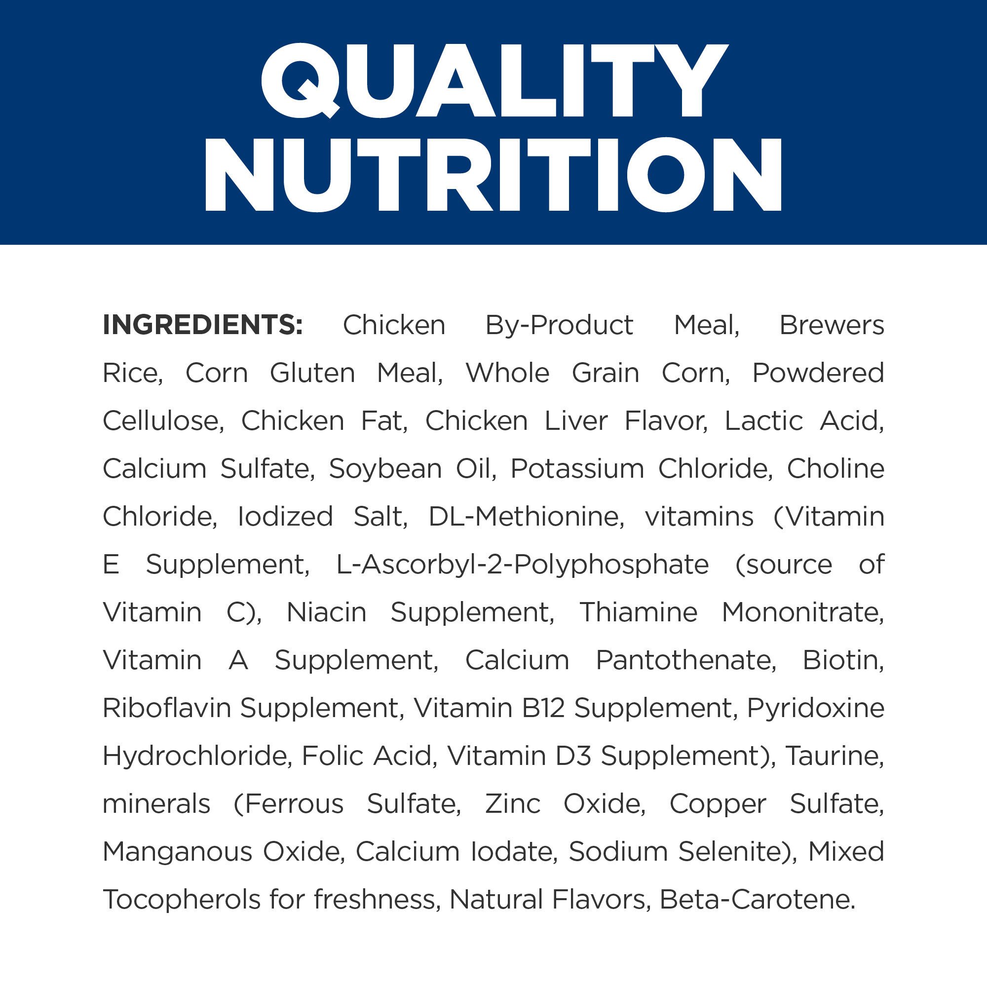 Chicken By-Product Meal, Brewers Rice, Corn Gluten Meal, Whole Grain Corn, Powdered Cellulose, Pork Fat, Chicken Liver Flavor, Calcium Sulfate, Lactic Acid, Soybean Oil, Potassium Chloride, Choline Chloride, DL-Methionine, vitamins (Vitamin E Supplement, L-Ascorbyl-2-Polyphosphate (source of vitamin C), Niacin Supplement, Thiamine Mononitrate, Vitamin A Supplement, Calcium Pantothenate, Riboflavin Supplement, Biotin, Vitamin B12 Supplement, Pyridoxine Hydrochloride, Folic Acid, Vitamin D3 Supplement), Taurine, Iodized Salt, Calcium Carbonate, minerals (Ferrous Sulfate, Zinc Oxide, Copper Sulfate, Manganous Oxide, Calcium Iodate, Sodium Selenite), Mixed Tocopherols for freshness, Phosphoric Acid, Beta-Carotene, Natural Flavors