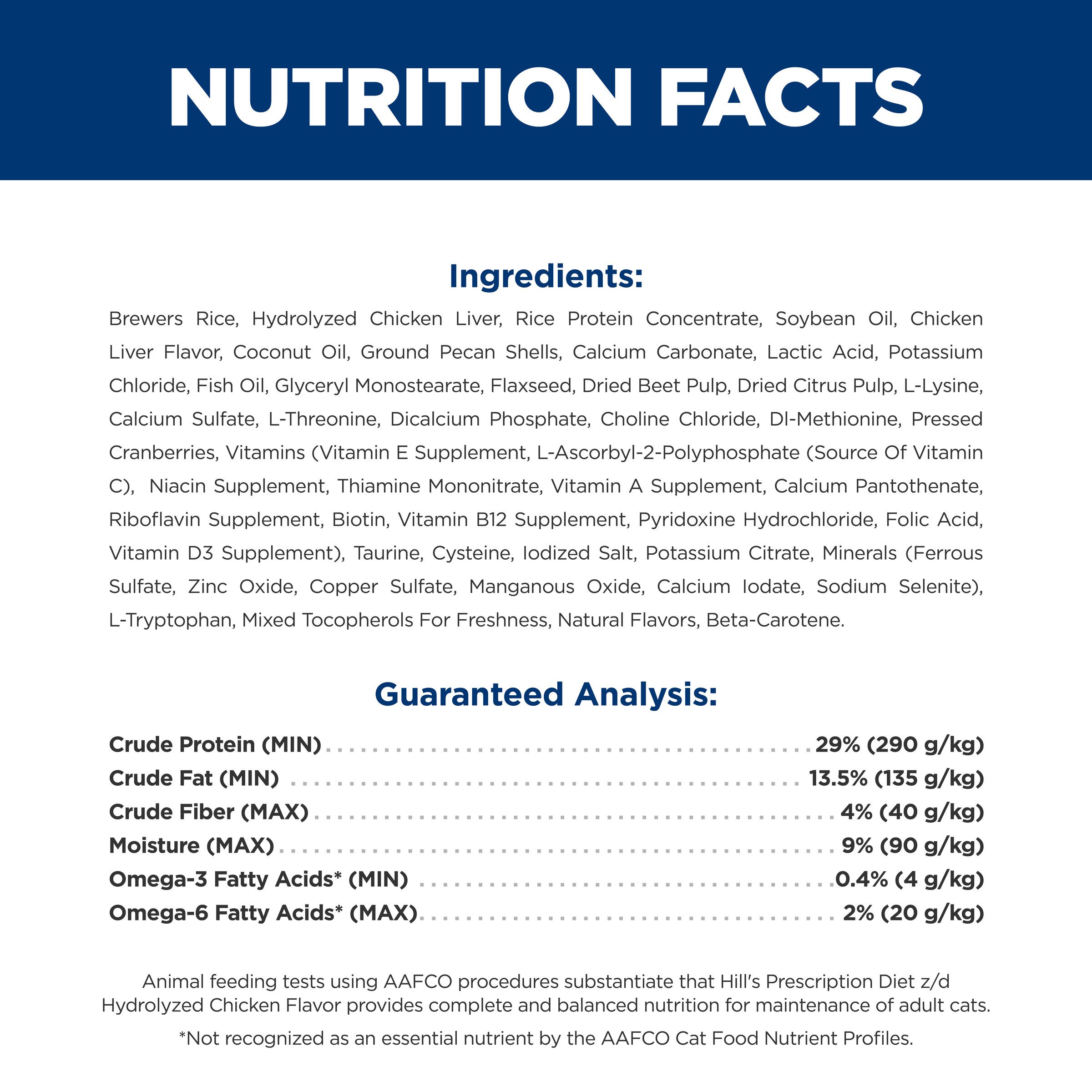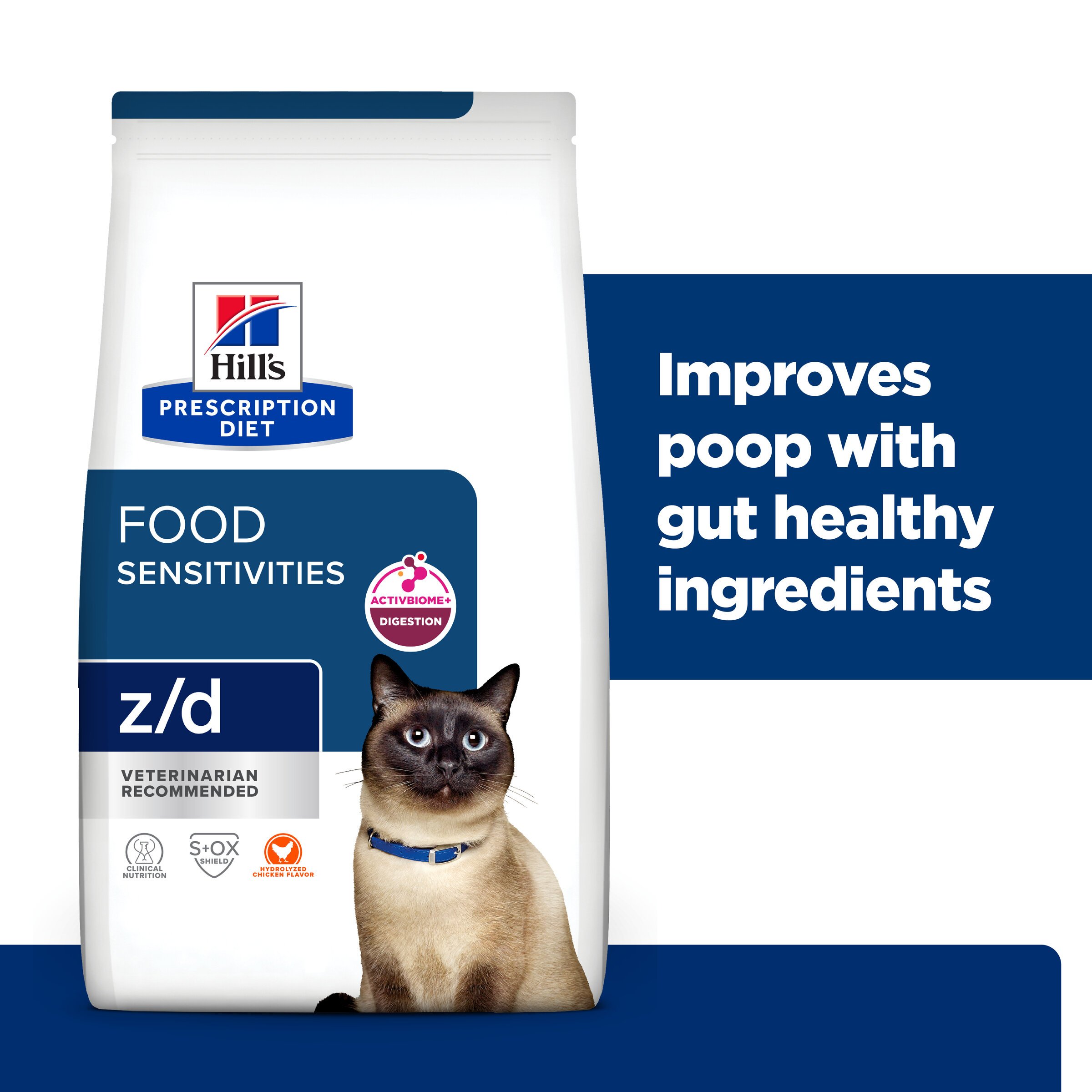 Hill's nutritionists & veterinarians developed Hill's Prescription Diet™ z/d™ clinical nutrition especially formulated to support your cat's skin and food sensitivities. In fact, z/d is clinically proven nutrition to help avoid adverse reactions to food.