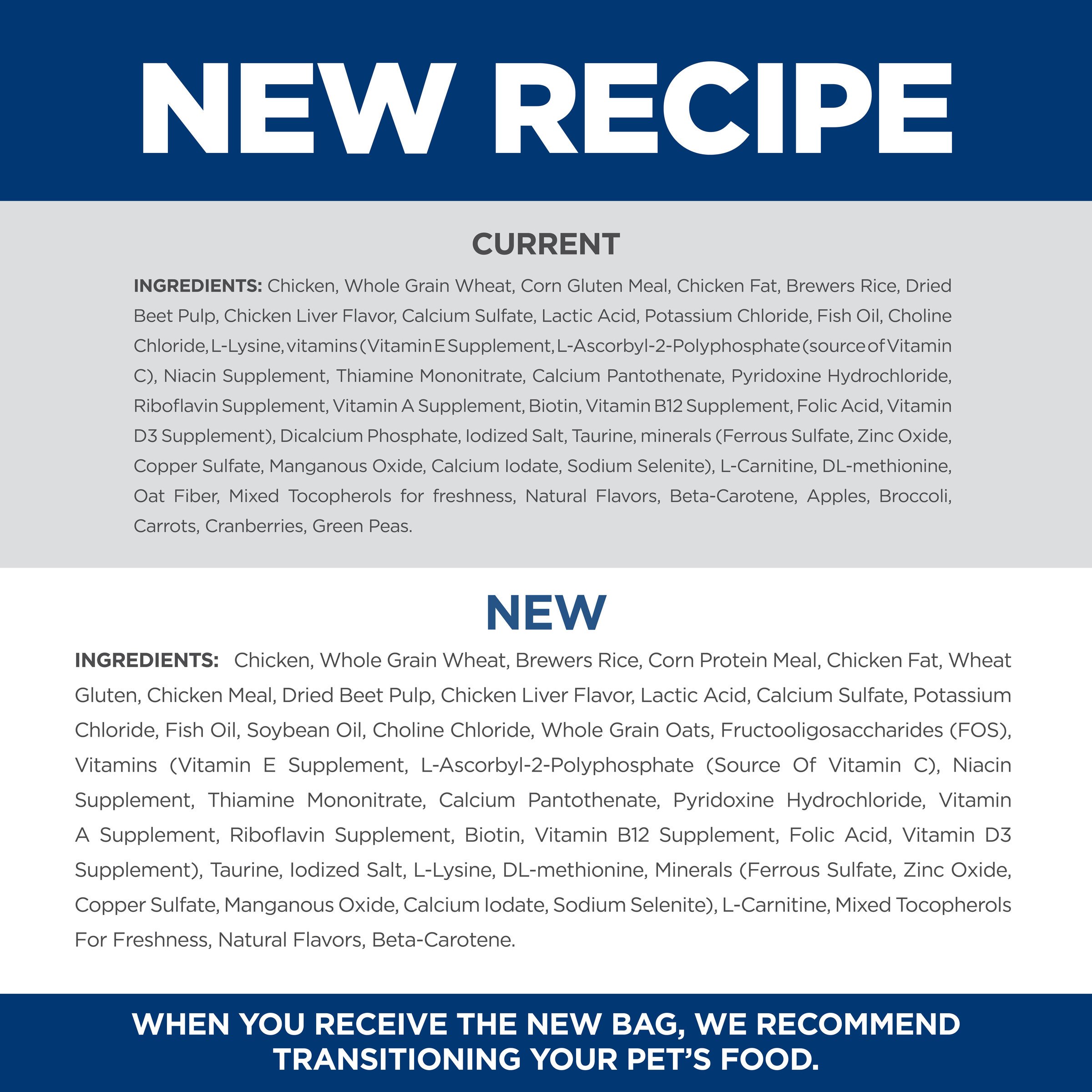 Chicken, Whole Grain Wheat, Corn Gluten Meal, Chicken Fat, Brewers Rice, Dried Beet Pulp, Chicken Liver flavour, Calcium Sulfate, Lactic Acid, Potassium Chloride, Fish Oil, Choline Chloride, L‐Lysine, vitamins (Vitamin E Supplement, L‐Ascorbyl‐2‐Polyphosphate (source of Vitamin C), Niacin Supplement, Thiamine Mononitrate, Calcium Pantothenate, Pyridoxine Hydrochloride, Riboflavin Supplement, Vitamin A Supplement, Biotin, Vitamin B12 Supplement, Folic Acid, Vitamin D3 Supplement), Dicalcium Phosphate, Iodized Salt, Taurine, minerals (Ferrous Sulfate, Zinc Oxide, Copper Sulfate, Manganous Oxide, Calcium Iodate, Sodium Selenite), L‐Carnitine, DL‐Methionine, Oat fibre, Mixed Tocopherols for freshness, Natural flavours, Beta‐Carotene, Apples, Broccoli, Carrots, Cranberries, Green Peas.