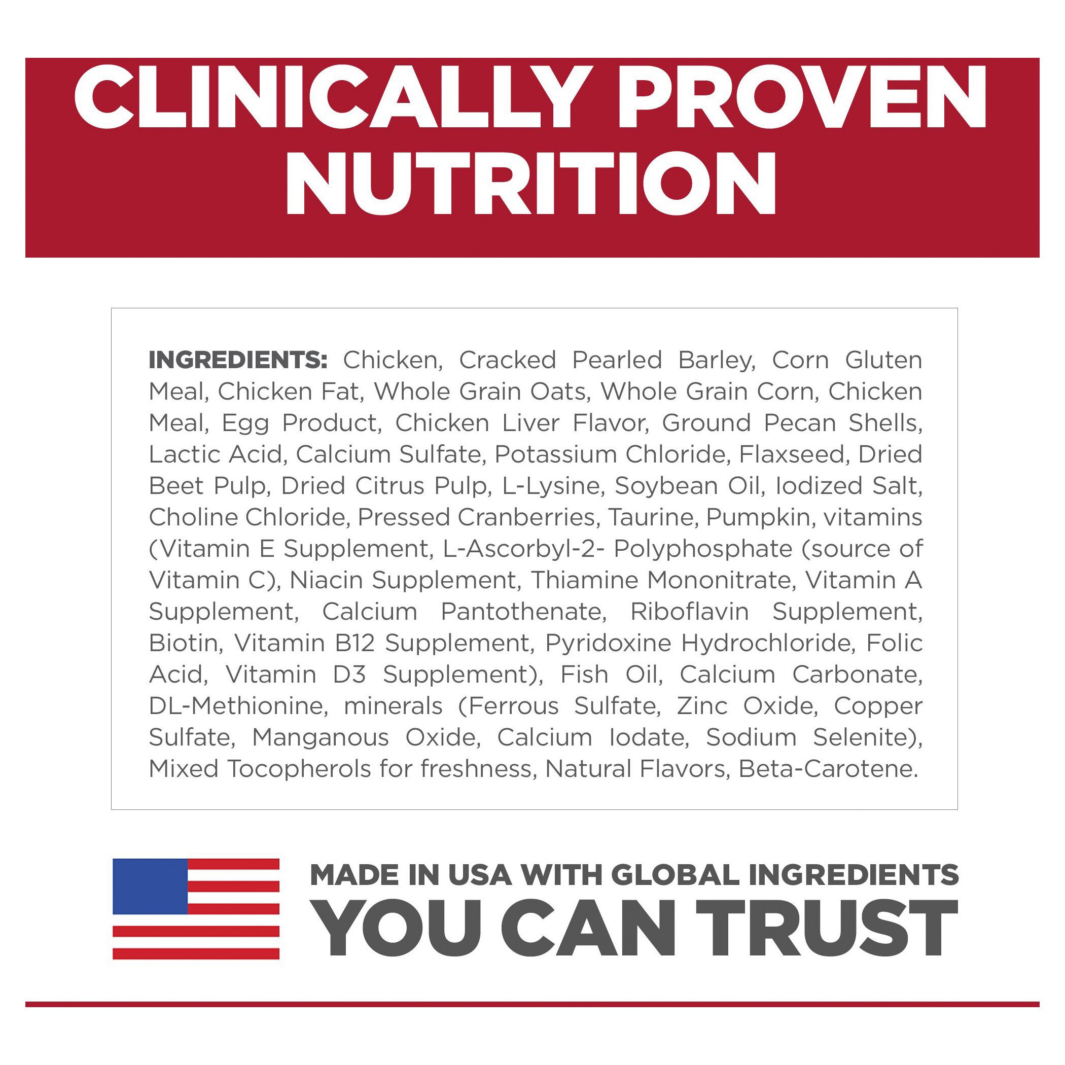 Chicken, Cracked Pearled Barley, Corn Gluten Meal, Chicken Fat, Whole Grain Oats, Whole Grain Corn, Chicken Meal, Egg Product, Chicken Liver Flavor, Ground Pecan Shells, Lactic Acid, Calcium Sulfate, Potassium Chloride, Flaxseed, Dried Beet Pulp, Dried Citrus Pulp, L-Lysine, Soybean Oil, Iodized Salt, Choline Chloride, Pressed Cranberries, Taurine, Pumpkin, vitamins (Vitamin E Supplement, L-Ascorbyl-2-Polyphosphate (source of Vitamin C), Niacin Supplement, Thiamine Mononitrate, Vitamin A Supplement, Calcium Pantothenate, Riboflavin Supplement, Biotin, Vitamin B12 Supplement, Pyridoxine Hydrochloride, Folic Acid, Vitamin D3 Supplement), Fish Oil, Calcium Carbonate, DL-Methionine, minerals (Ferrous Sulfate, Zinc Oxide, Copper Sulfate, Manganous Oxide, Calcium Iodate, Sodium Selenite), Mixed Tocopherols for freshness, Natural Flavors, Beta-Carotene.