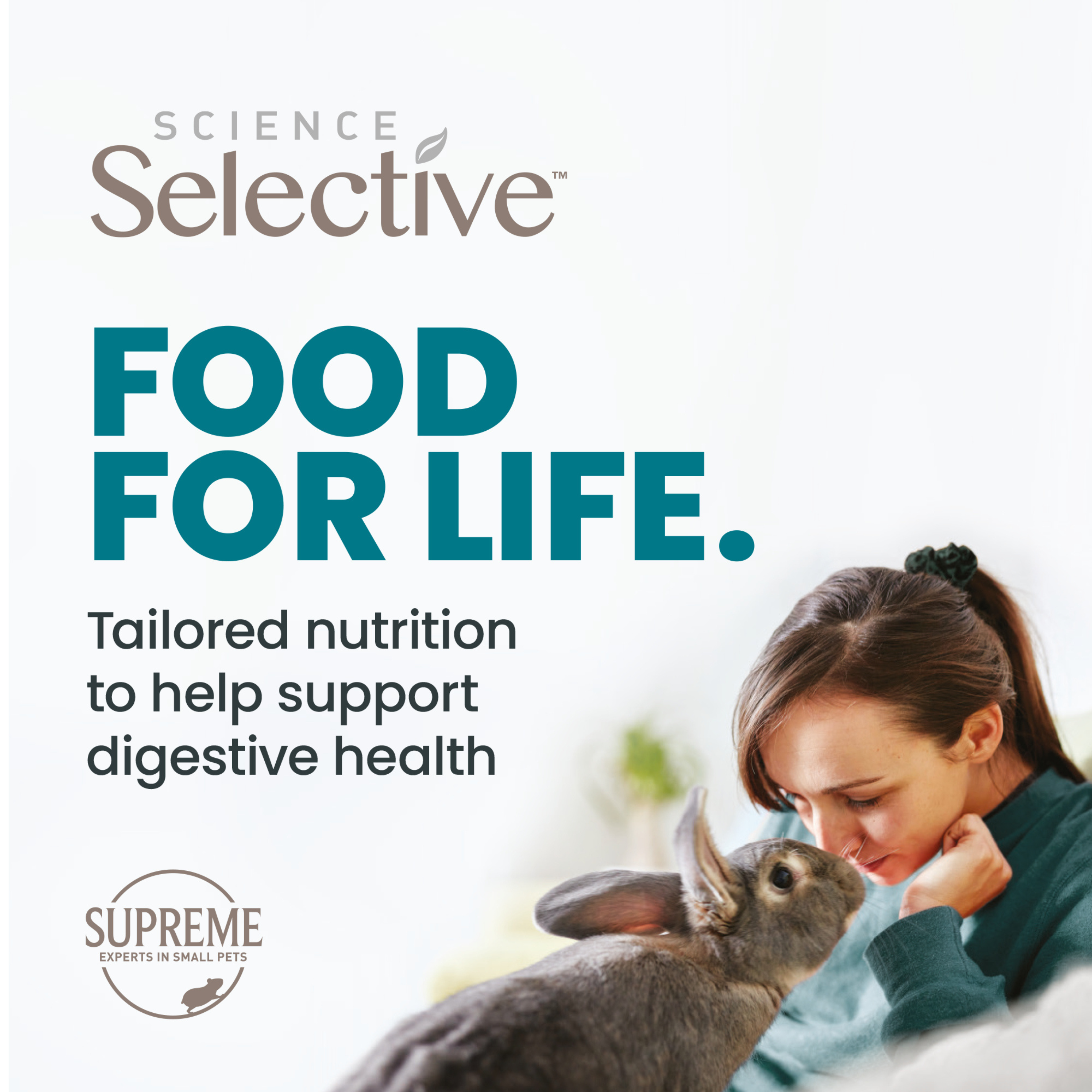 Vets believe that high fibre is most important when recommending a rabbit food. Wild rabbits mainly eat grass, which naturally contains 20-25% fibre and rabbits’ teeth and digestive systems have evolved to need a high fibre diet. Supreme Science Selective has 25% fibre so you can provide your rabbits with a high fibre, tasty diet that will help to keep your pets in the very best of health, naturally.
