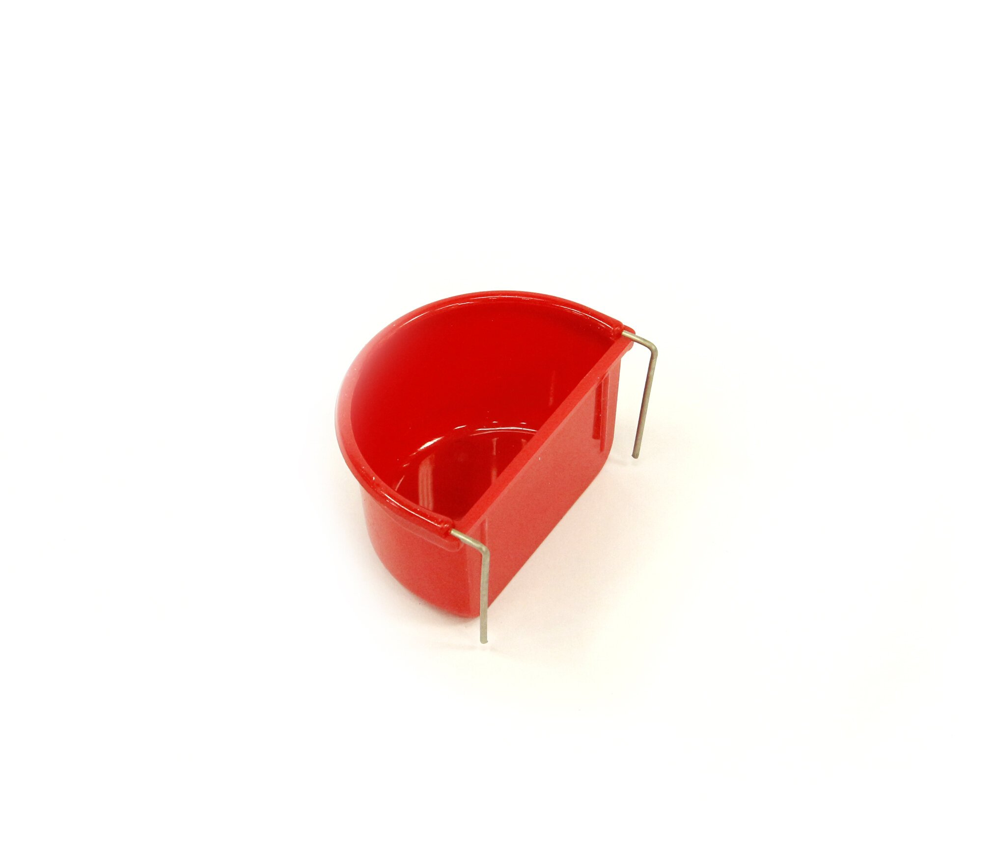 D-shaped feeder with metal hooks for small birds. The plastic is safe and easy to clean. The smooth D-shape allows your small bird to perch on the edge while taking their feed from the container.