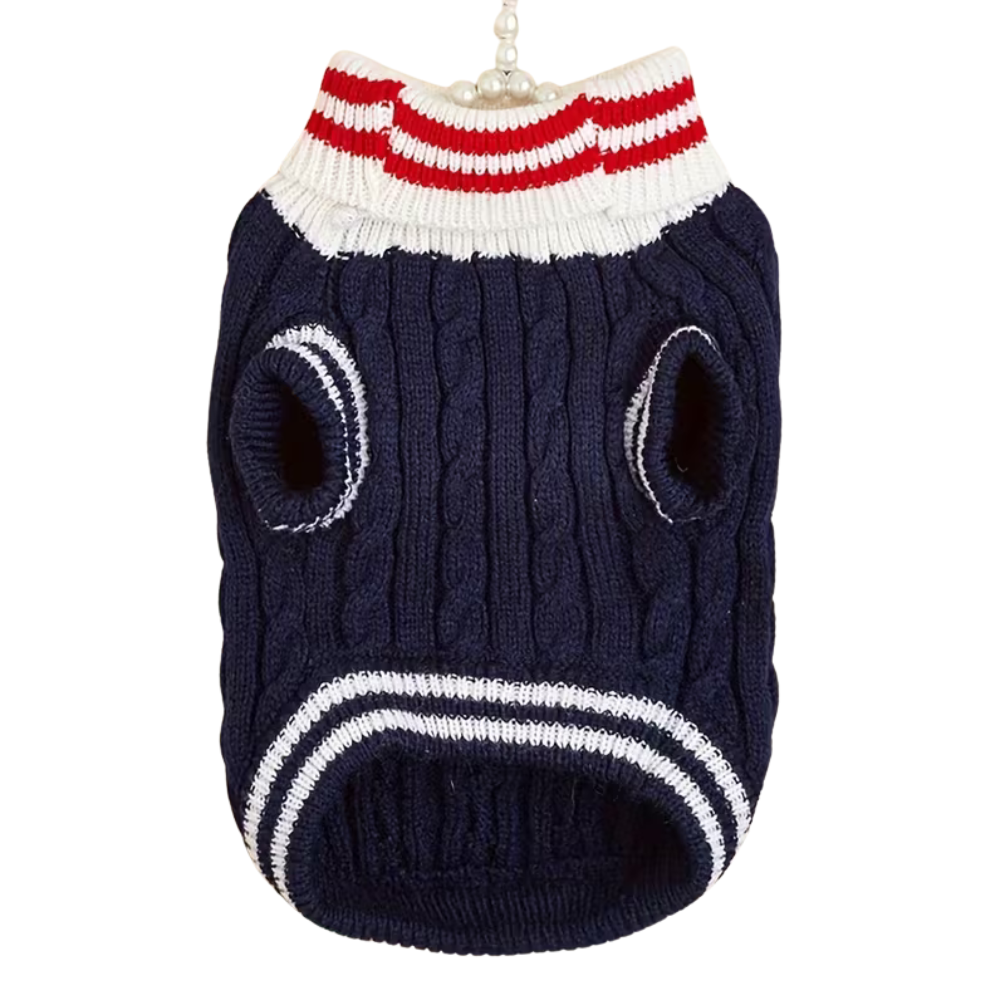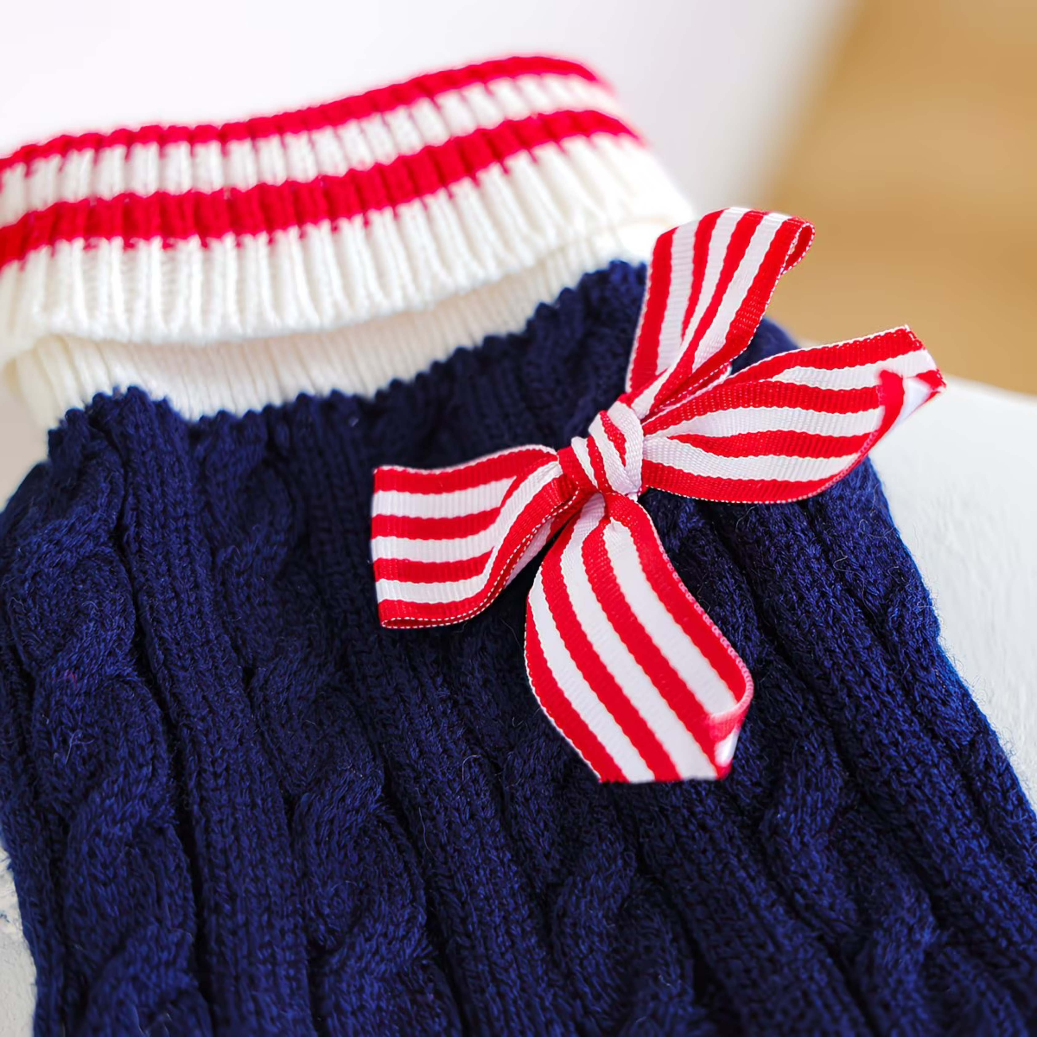 Keep your pooch warm this winter with this beautifully knitted sweater, available in red or navy. Features coloured stripes and a bow.