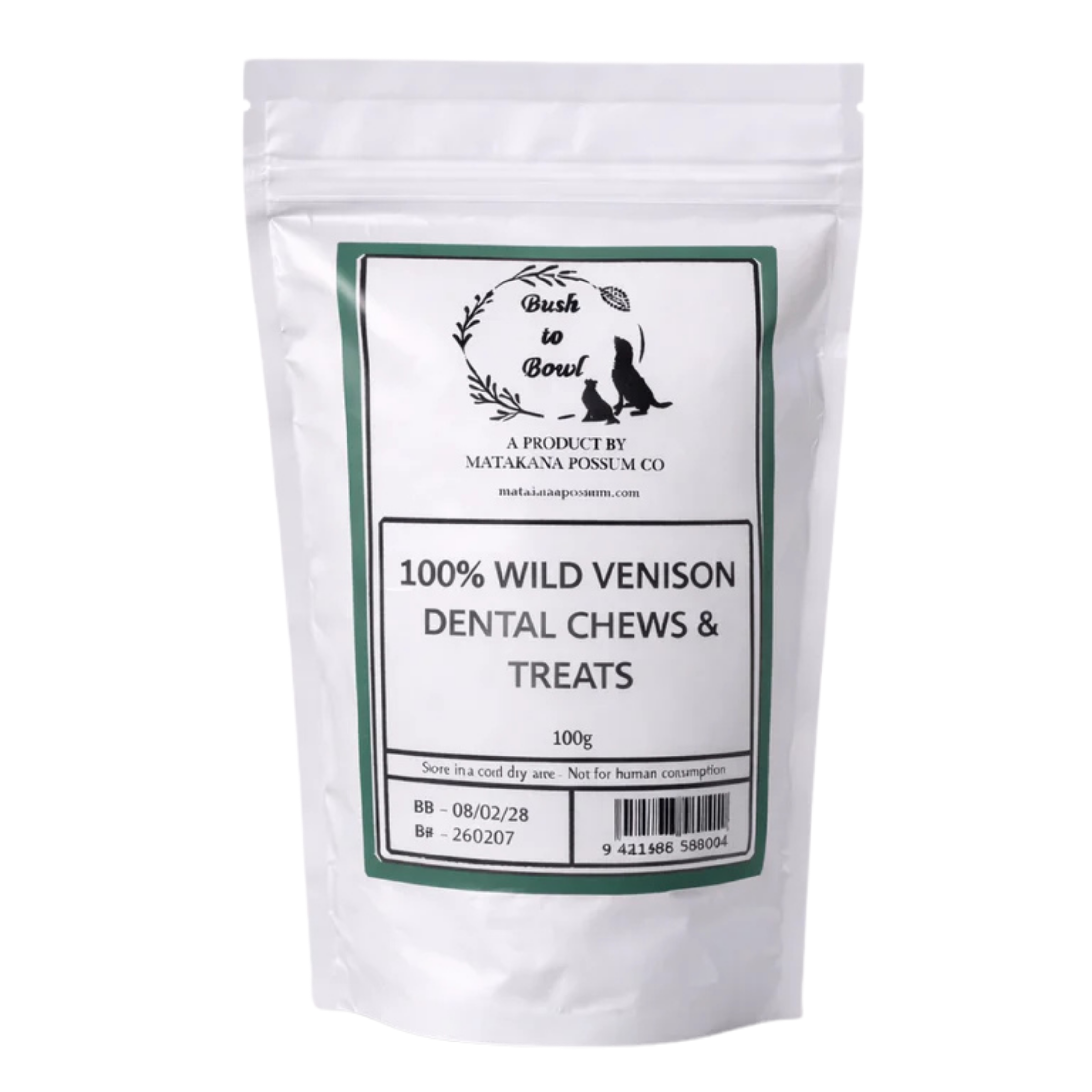 Bush to Bowl raw dried 100% wild venison chews are made from premium, wild-caught venison, offering a naturally lean, high-protein treat for your pet. These chews are rich in essential vitamins and minerals, supporting muscle maintenance, joint health, and overall vitality. Perfect for pets with food sensitivities or allergies, the chews are air-dried to retain the natural flavours and nutrients, with no artificial additives or preservatives. Ethically sourced and crafted in New Zealand, they provide a satisfying and healthy alternative to conventional treats.