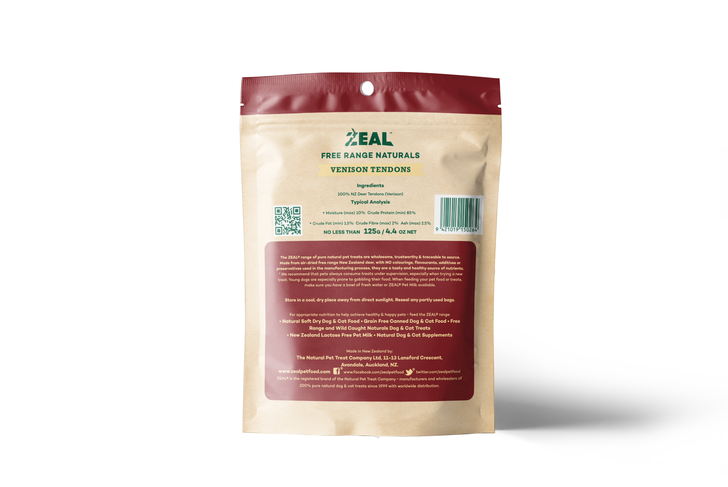 Whole lengths of venison tendons. A hard chew, high in natural sodium.